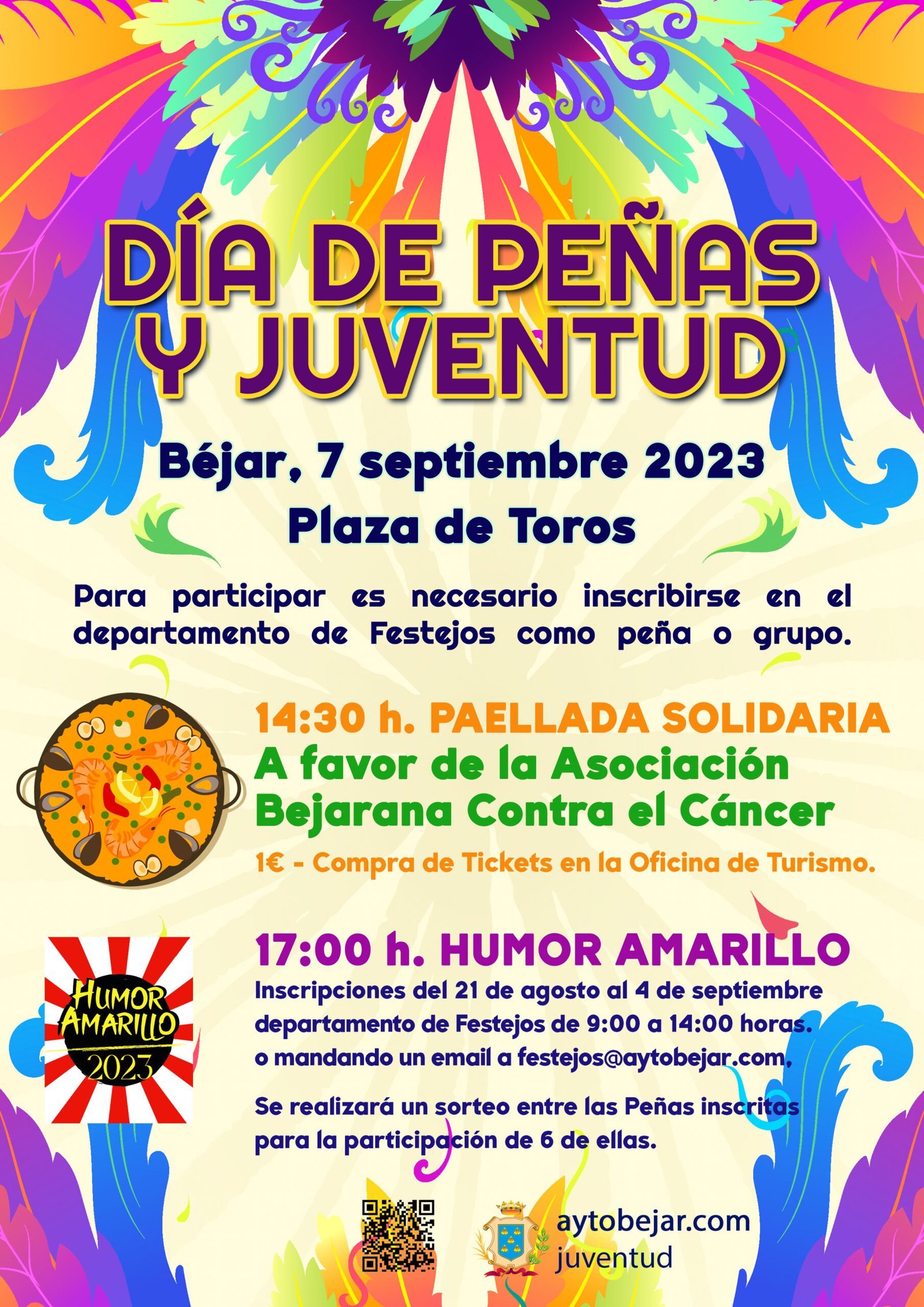 Día de peñas y juventud, será el 7 de septiembre en la plaza de toros, con paella solidaria a favor de la Asociación Bejarana Contra el Cáncer. La venta de tickets se podrá realizar en la Oficina de Turismo.