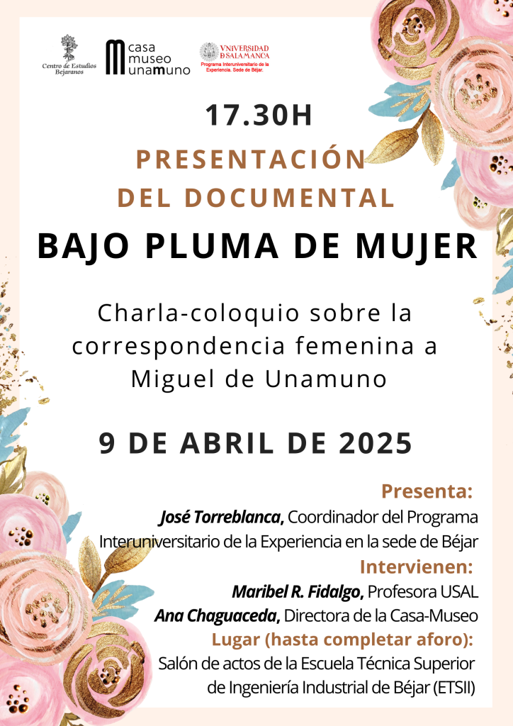 El próximo miércoles 9 de abril, Béjar acogerá una actividad cultural de gran valor histórico y social: la proyección del audiovisual y posterior coloquio del proyecto “Bajo pluma de mujer”, centrado en la correspondencia femenina conservada en el archivo de la Casa-Museo Unamuno de Salamanca.