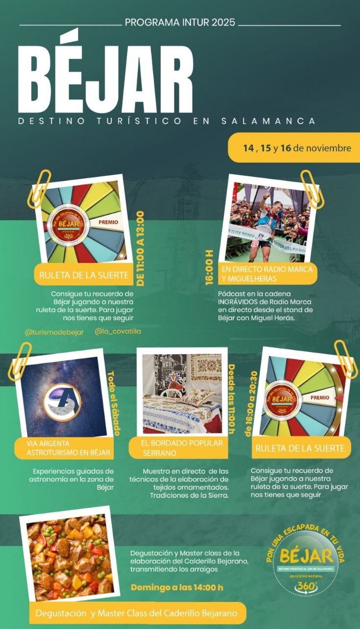 Desde el viernes y durante el fin de semana, la feria se abrirá al público general en INTUR Viajeros. Béjar centrará su promoción en un stand de diseño de 32 metros cuadrados , cuyo eje será una pantalla principal de 6×3 metros. En ella se proyectarán contenidos audiovisuales sobre los principales activos de la comarca, incluyendo las rutas de senderismo, la Sierra de Béjar, la estación de esquí La Covatilla, el paraje de El Bosque y festividades de interés como el Corpus Christi o los festivales de Blues y Abejarock.