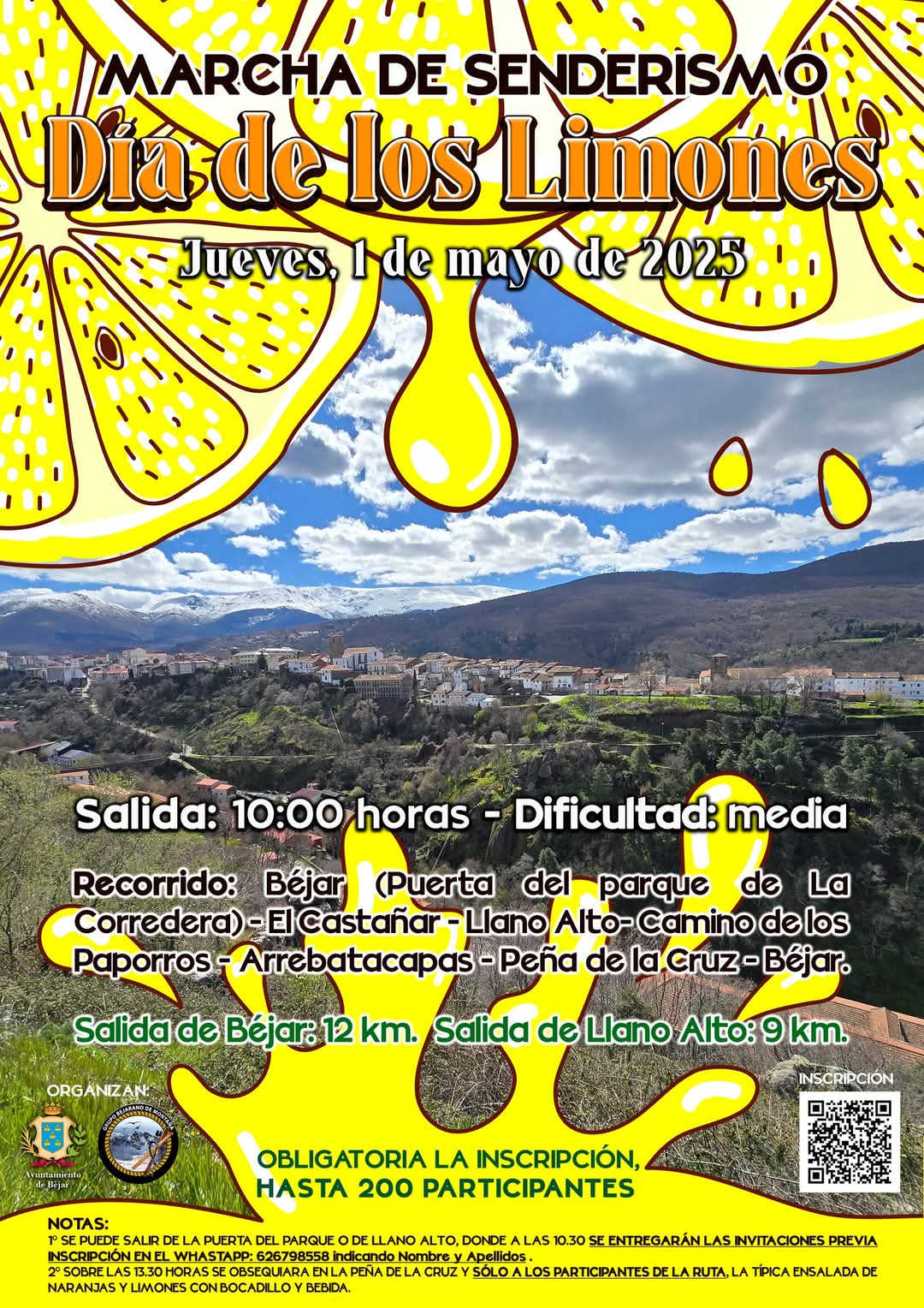 Por último, el 1 de mayo tendrá lugar la esperada Marcha del Día de los Limones, organizada por el Grupo Bejarano de Montaña con el apoyo del Ayuntamiento. La salida será a las 10:00 desde el parque de La Corredera, con dos rutas: una larga hasta Arrebatacapas y otra más corta hasta la Peña de la Cruz. Al finalizar, los participantes disfrutarán de un bocadillo y una ensalada de limones a partir de las 13:30 h. Las inscripciones están abiertas hasta cubrir las 200 plazas disponibles en el teléfono 626798558.