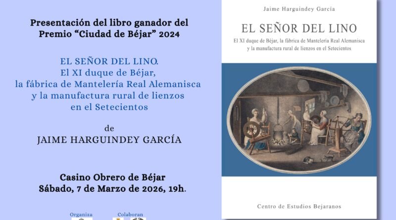 Tras el aplazamiento forzado por las inclemencias meteorológicas el mes pasado, el Casino Obrero de Béjar, histórico ateneo y corazón social de la villa, acogerá el próximo sábado, 7 de marzo de 2026, la presentación oficial de la obra titulada «El señor del lino. El XI duque de Béjar, la fábrica de Mantelería Real Alemanisca y la manufactura rural de lienzos en el Setecientos».