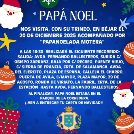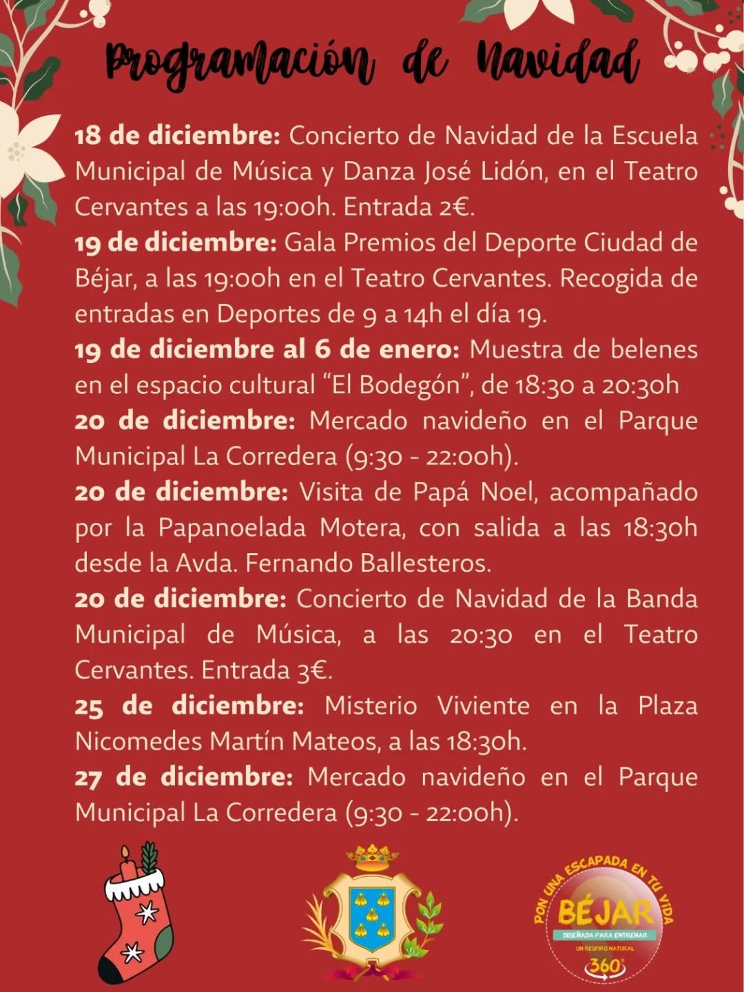 La programación continuará el 25 de diciembre con el Misterio Viviente en la plaza Nicomedes Martín Mateos, a las 18:30 horas, una representación que cada año reúne a numerosos vecinos y visitantes, y se cerrará el 27 de diciembre con una nueva jornada del mercado navideño en La Corredera, nuevamente en horario de 9:30 a 22:00 horas. Con este cartel, Béjar refuerza su apuesta por una Navidad participativa, cultural y familiar, combinando música, tradición, comercio y actividades al aire libre que invitan tanto a vecinos como a visitantes a disfrutar de la ciudad durante las fiestas.