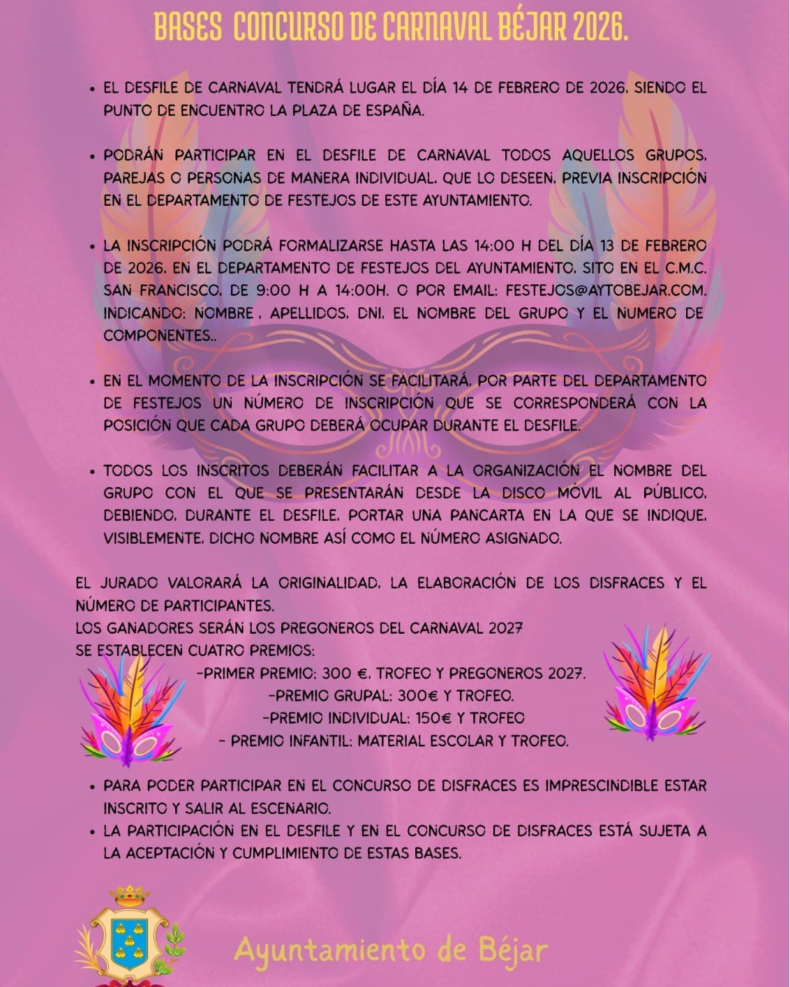 El Ayuntamiento anima a vecinos y visitantes a participar en el concurso de disfraces, abierto a grupos, parejas e individuales, cuyas inscripciones estarán disponibles hasta el 13 de febrero a las 14:00 horas. Originalidad, creatividad y ganas de pasarlo bien serán los ingredientes clave de una celebración que promete llenar Béjar de ambiente festivo.