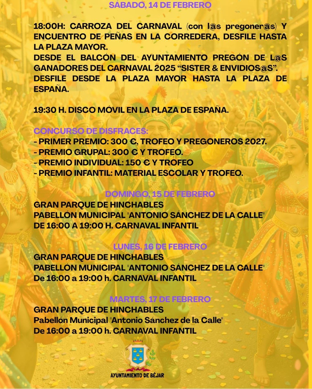 Béjar ya huele a Carnaval y la ciudad se prepara para vivir uno de los fines de semana más esperados del año. Del 14 al 17 de febrero, las calles se llenarán de música, disfraces, alegría y participación ciudadana con la celebración del Carnaval Béjar 2026, una cita pensada para disfrutar en familia y con amigos.