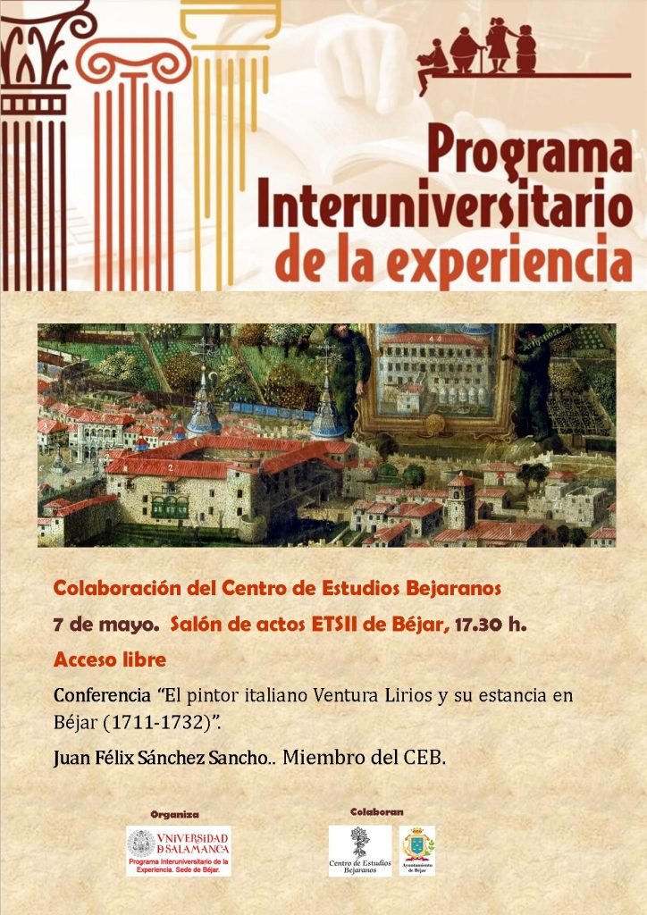 La conferencia se centra en la figura de Ventura Lirios, pintor italiano que llegó a Béjar en 1711 bajo el mecenazgo del XI Duque de Béjar, Juan Manuel II (1686-1747). Su misión fue decorar al fresco varias estancias del Palacio Ducal, pero su actividad se extendió a iglesias locales y encargos particulares.
