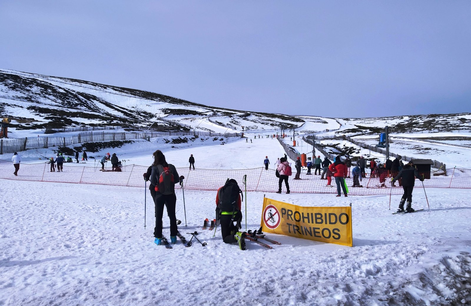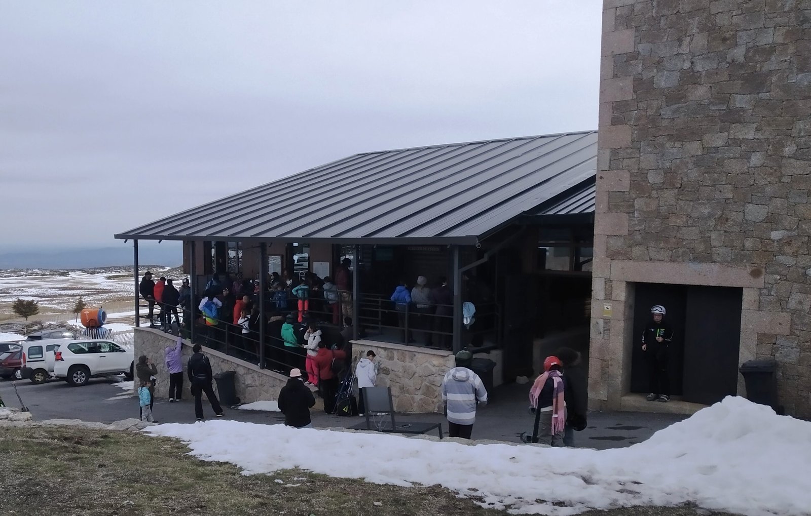 El domingo amanece con nubosidad de tipo alto y temperatura de 9 grados que subirían hasta 11 a las diez de la mañana, la humedad se mantiene de momento en el 40%. A esa hora, el aparcamiento principal, donde aún quedan montones de nieve, está casi lleno. Ante la taquilla se ha formado una cola de unos cincuenta metros; en las escaleras de acceso al alquiler también hay larga cola; en este caso se debe señalar que esta dependencia solo puede funcionar al 50%, porque de las dos líneas de atención, sólo hay personal para que funcione una. La tienda permanece cerrada. En la escuela de esquí, que cuenta con once profesores esa mañana, ya sólo quedan clases libres en el último turno de las 15:30 horas y el acceso está controlado por personal extra del departamento forestal. En Facebook no hay publicación nueva desde la víspera, hasta las doce del mediodía y la webcam de El Cerrojo sigue bloqueada desde el domingo anterior.