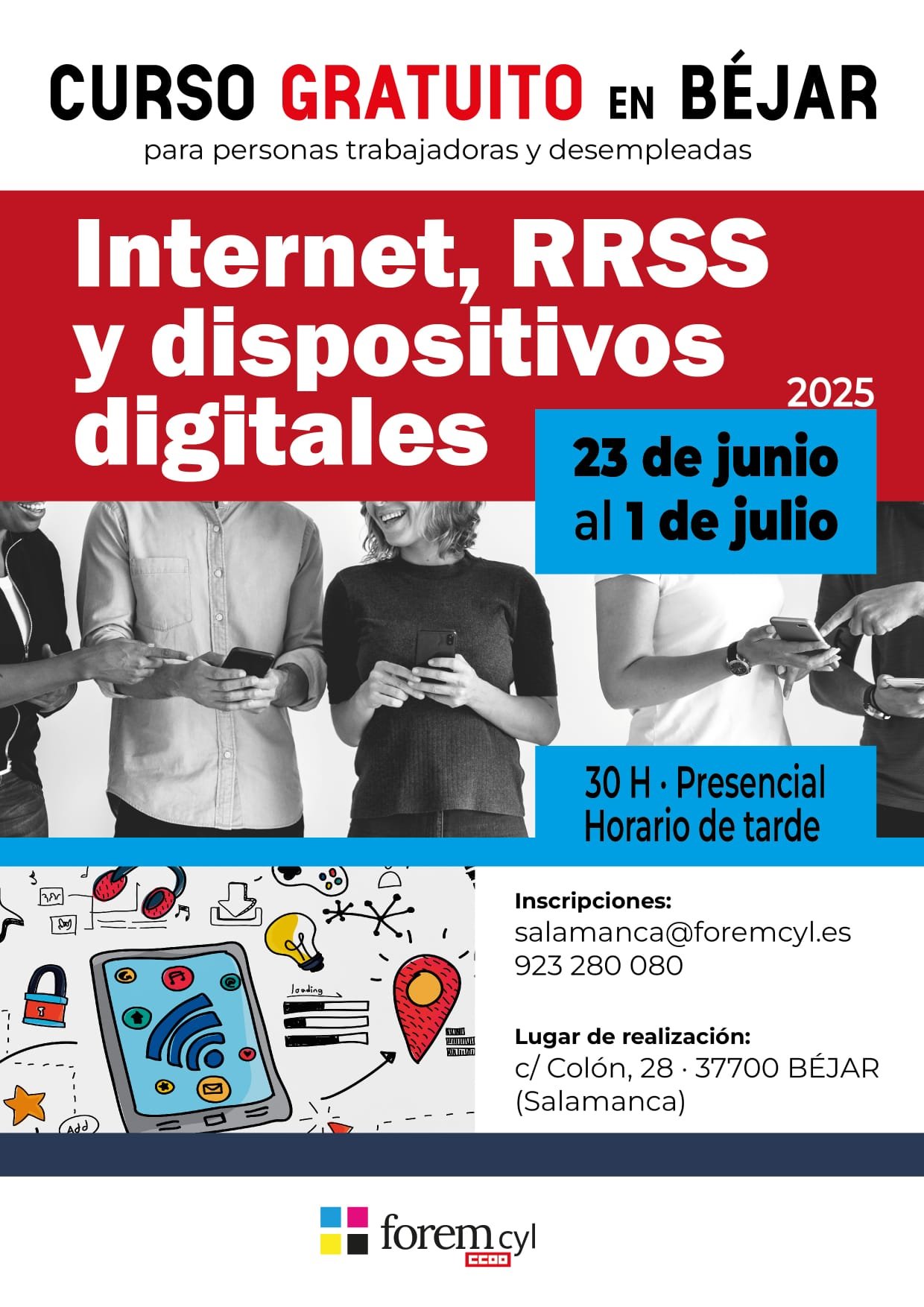 La sede de Foremcyl-CCOO en Béjar, situada en la calle Colón número 28 (antigua Amuebladora Valenciana), acogerá un nuevo curso de internet, redes sociales y dispositivos digitales, dirigido a trabajadores y desempleados. Es totalmente gratuito, presencial, y tendrá lugar del 23 de junio al 1 de julio.