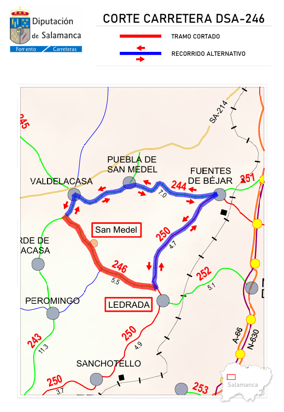 Con motivo de las necesarias obras de ensanche y refuerzo del firme, la carretera DSA-246, que une las localidades de Valdelacasa y Ledrada, permanecerá cerrada al tráfico de vehículos en un tramo vital para la conexión de la zona.