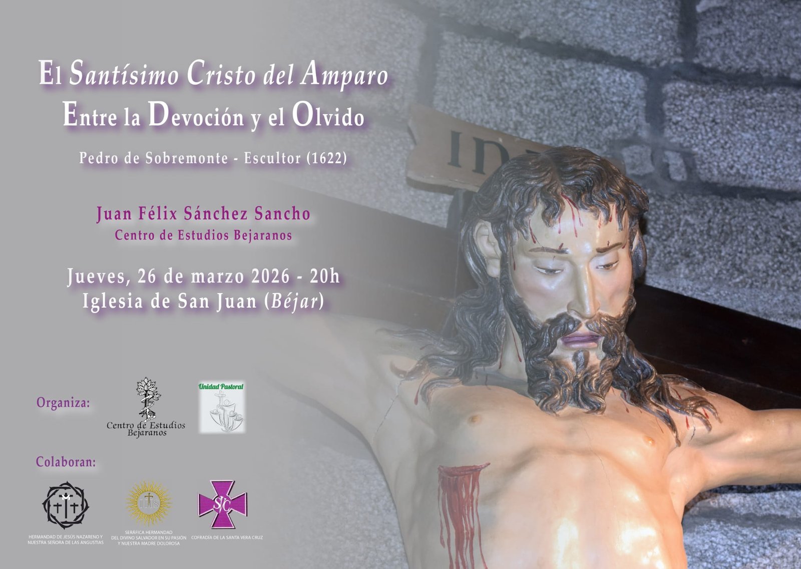 Sánchez Sancho no se limitará a la ficha técnica. El conferenciante se propone rescatar la antigua leyenda que motivó la creación de la imagen, analizando la figura de su promotor y el contexto histórico-artístico de una época en la que Béjar bullía bajo la influencia de sus fundaciones conventuales. El análisis comparativo con otras obras de Sobremonte servirá para situar esta talla en el lugar que le corresponde dentro de la historia del arte español.