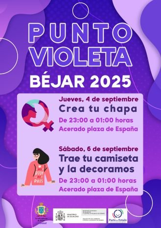 El Ayuntamiento de Béjar, en colaboración con el Ministerio de Igualdad y el Pacto de Estado contra la Violencia de Género, pone en marcha una nueva edición del Punto Violeta durante las fiestas patronales de la ciudad. Esta iniciativa busca concienciar, prevenir y sensibilizar sobre la violencia de género, especialmente entre la población más joven, a través de actividades creativas y participativas.