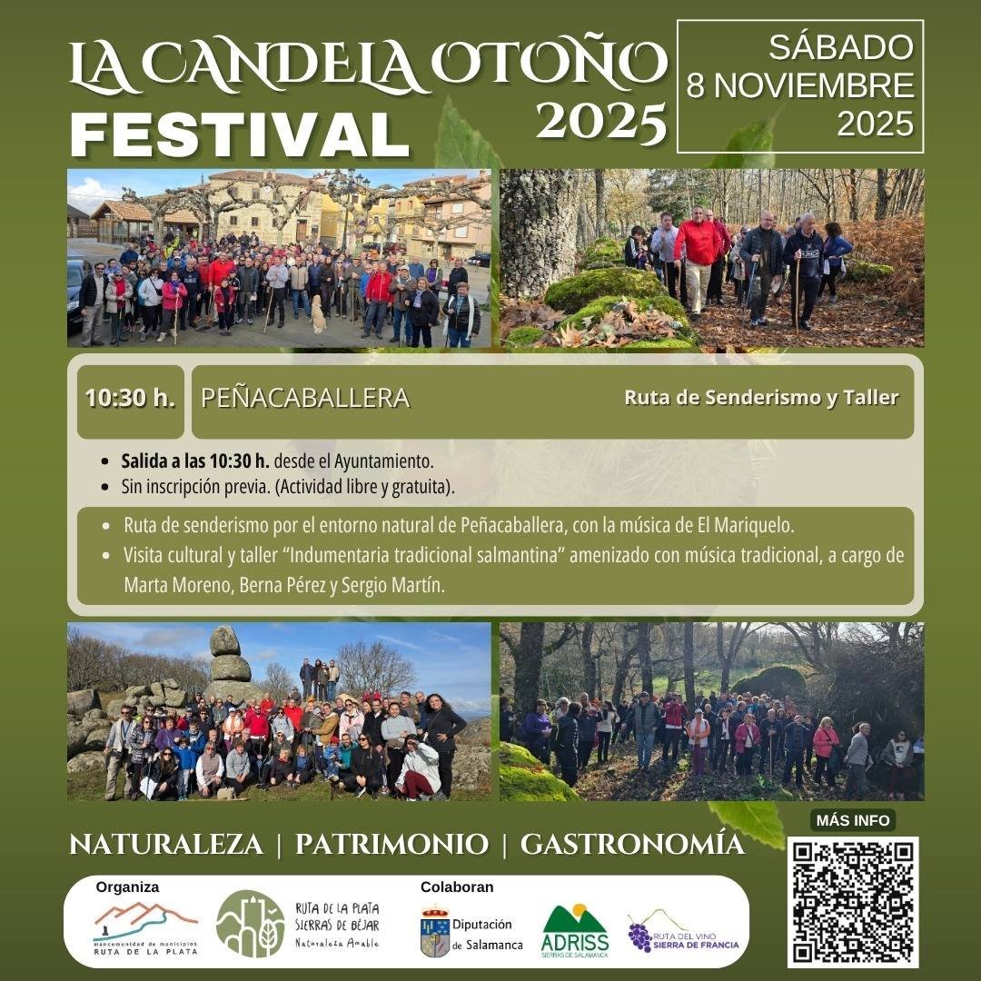 El sábado 8 de noviembre de 2025, la atención se centrará en Peñacaballera. La jornada dará inicio a las 10:30 horas, con la salida de una ruta de senderismo desde el Ayuntamiento. El recorrido, a través del entorno natural de la localidad, estará amenizado por la música tradicional de El Mariquelo. La programación vespertina incluirá una visita al patrimonio cultural local y un taller sobre la «Indumentaria tradicional salmantina». Este taller será impartido por los especialistas Marta Moreno, Berna Pérez y Sergio Martín, y se complementará con música tradicional en vivo.
