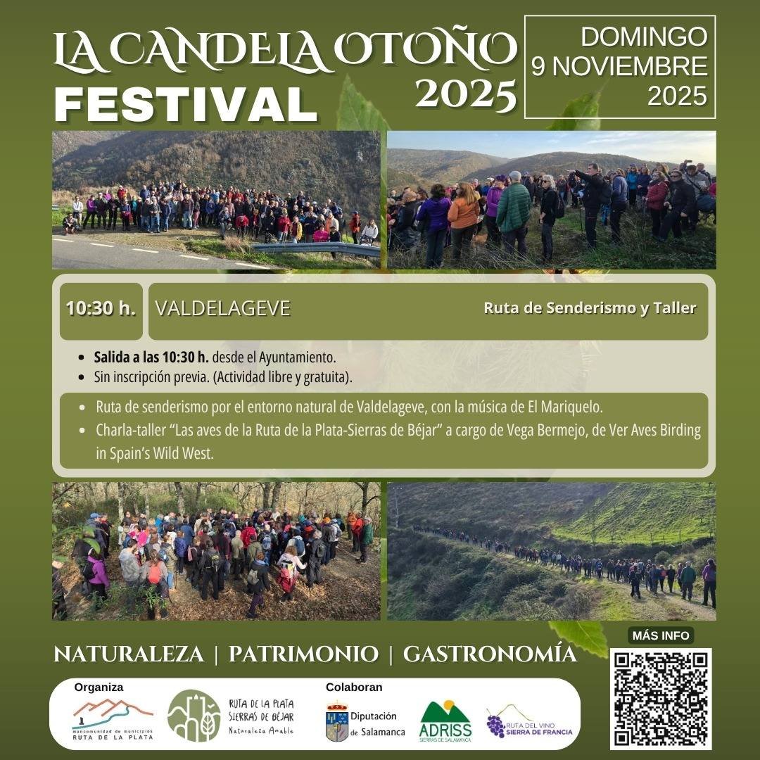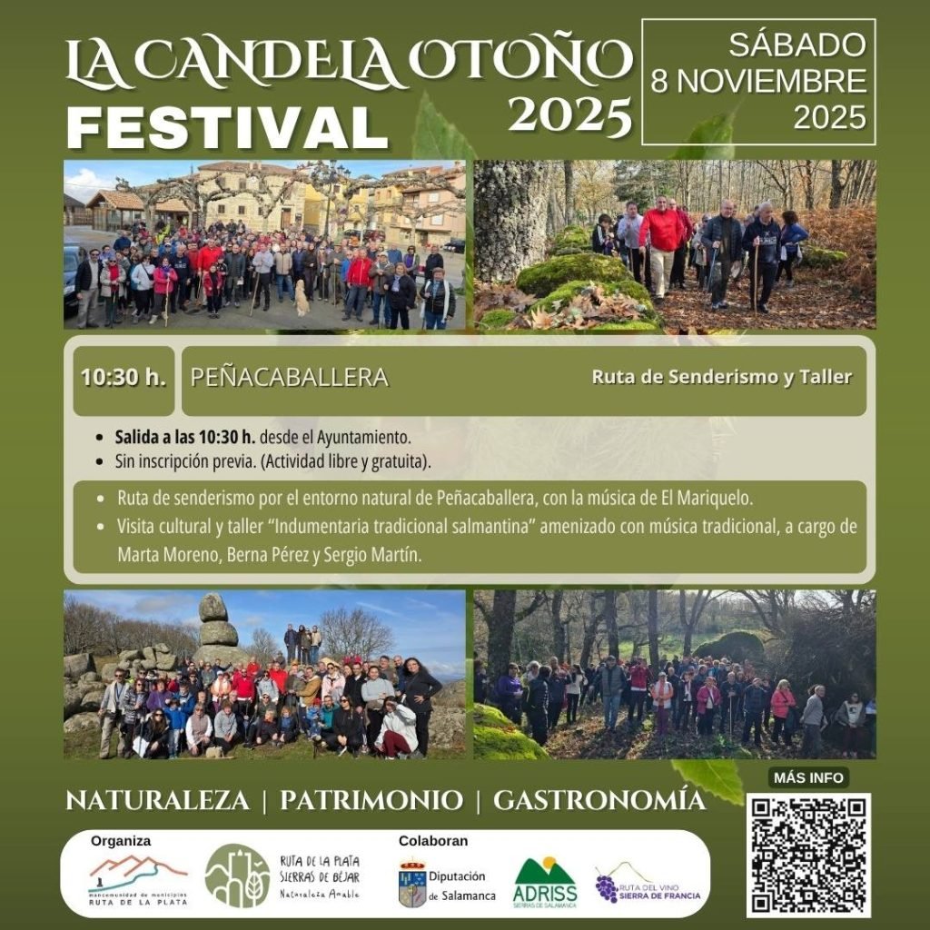 El Festival La Candela Otoño 2025 prosigue su itinerario cultural y de naturaleza este fin de semana, anclándose en dos localidades de la Ruta de la Plata-Sierras de Béjar. La iniciativa, que combina senderismo, patrimonio cultural y gastronomía, espera congregar a un nutrido público en un marco de previsión meteorológica favorable. Las actividades programadas se ofrecen de manera libre y gratuita.