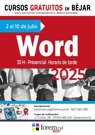 La sede de FOREMCYL en Béjar será el escenario de un curso intensivo de Microsoft Word, diseñado para mejorar las habilidades informáticas de los participantes y potenciar su empleabilidad en el mercado laboral actual. El curso, de 30 horas de duración y modalidad presencial, tendrá lugar del 2 al 10 de julio.