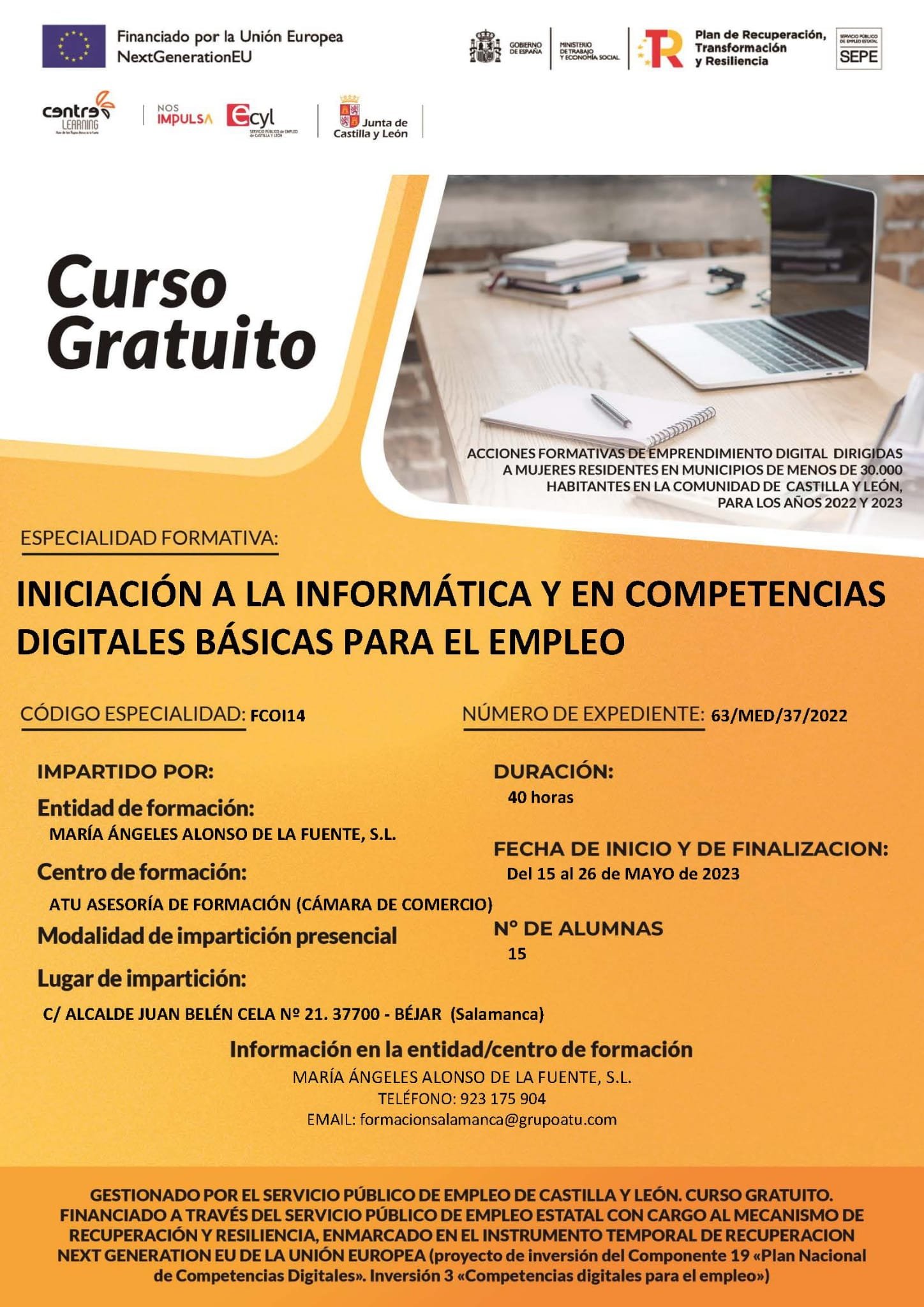 - Curso de 40 horas dirigido exclusivamente a mujeres desempleadas, en situación de mejora de empleo, en ERTE o fijas discontinuas en periodos de inactividad