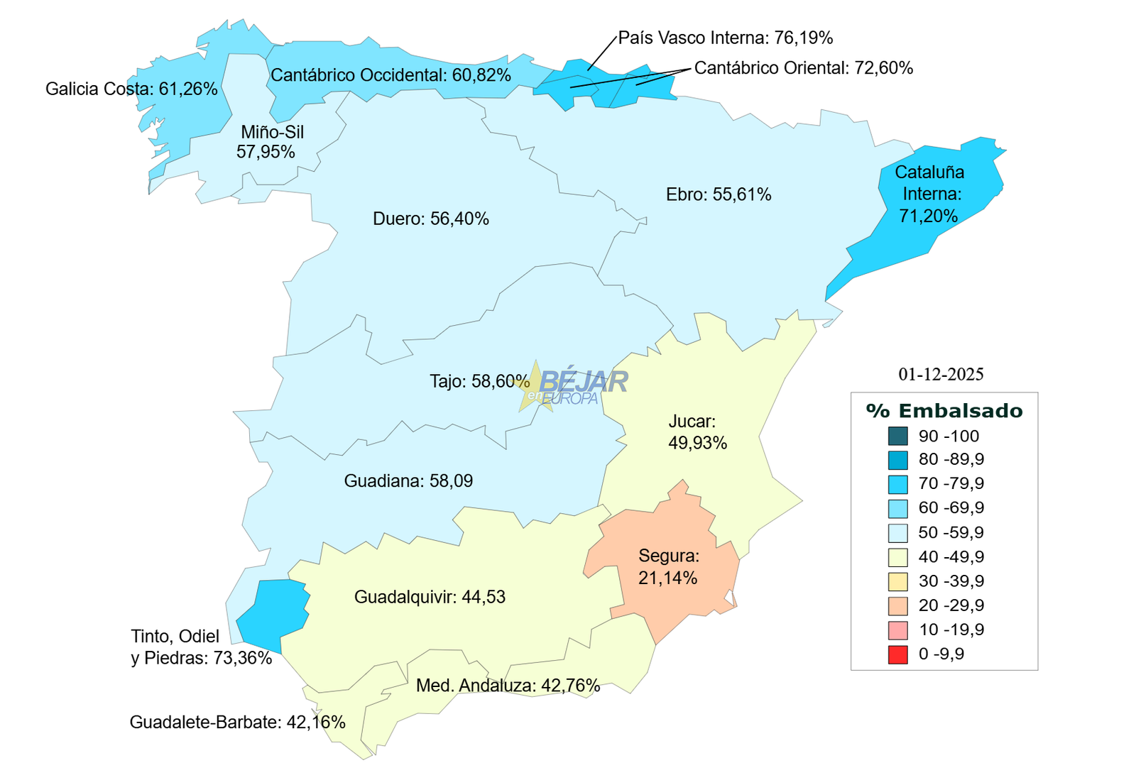 La situación de Navamuño se contextualiza dentro de la cuenca hidrográfica del Tajo, que se encuentra embalsada al 58,60%, un porcentaje superior al del embalse bejarano pero que mantiene a este dentro de la normalidad de la demarcación. La cuenca duplica prácticamente los niveles de zonas en situación mucho más delicada, como la del Segura, que apenas llega al 21%, o Guadalete-Barbate, con 42%. En el norte peninsular, en cambio, destacan valores significativamente más altos como los del País Vasco interno (76%) o Cataluña interna (71%), impulsados por un otoño muy húmedo.