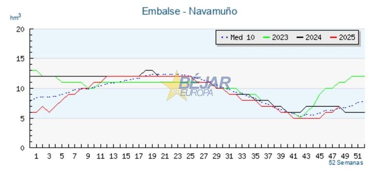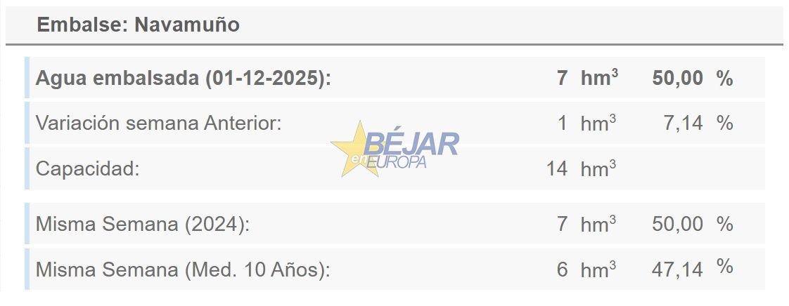La reserva hídrica del embalse de Navamuño continúa mejorando y ofrece un respiro en el final del otoño. Según los últimos datos disponibles, correspondientes al 1 de diciembre de 2025, el pantano alcanza los 7 hectómetros cúbicos, lo que supone un 50% de su capacidad total (14 hm³). Esta cifra representa un incremento de 1 hm³ respecto a la semana anterior, un avance relevante tras meses de descensos continuados.