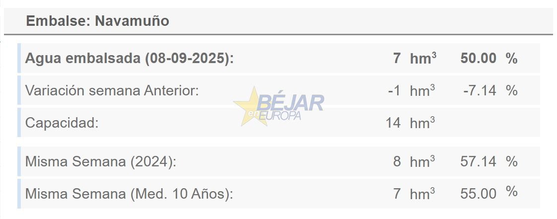 El embalse de Navamuño registra un volumen de agua embalsada del 50 % respecto a su capacidad total. En relación al mismo periodo del año 2024 se observa una diferencia negativa de un 7,14%, así como también de un 5% por debajo de la media de la última década.