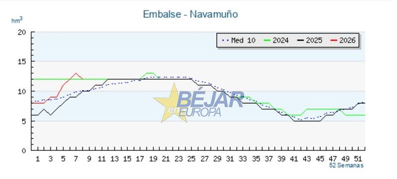 El comportamiento del embalse resulta especialmente significativo al compararlo con el conjunto de la cuenca. Los datos indican que Navamuño mantiene un nivel de reserva un 3% superior a la media de la Confederación Hidrográfica del Tajo, organismo del que depende la gestión del sistema. Este diferencial evidencia que la cabecera del Cuerpo de Hombre está respondiendo mejor que otros sectores de la demarcación hidrográfica.