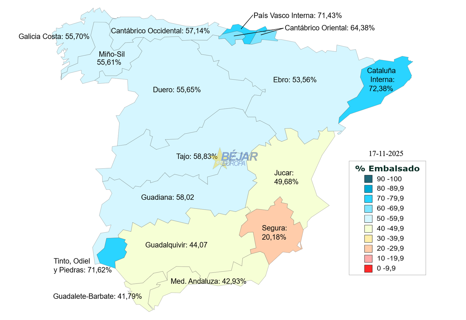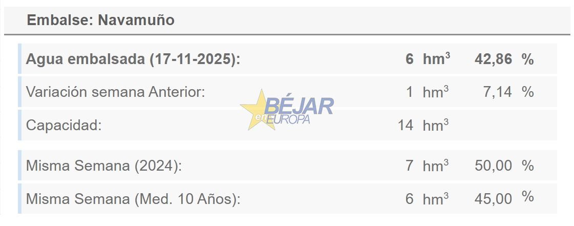 En el contexto de la cuenca del Tajo, a la que pertenece Navamuño, los datos ofrecen un marco más amplio. El conjunto de la cuenca registra un 58,83% de agua embalsada, un nivel claramente superior al del pantano bejarano. Esta diferencia evidencia la desigual distribución de precipitaciones y la mayor vulnerabilidad de algunos embalses de menor capacidad. Navamuño permanece muy por debajo de ese umbral y entre los valores propios de zonas con mayor estrés hídrico.