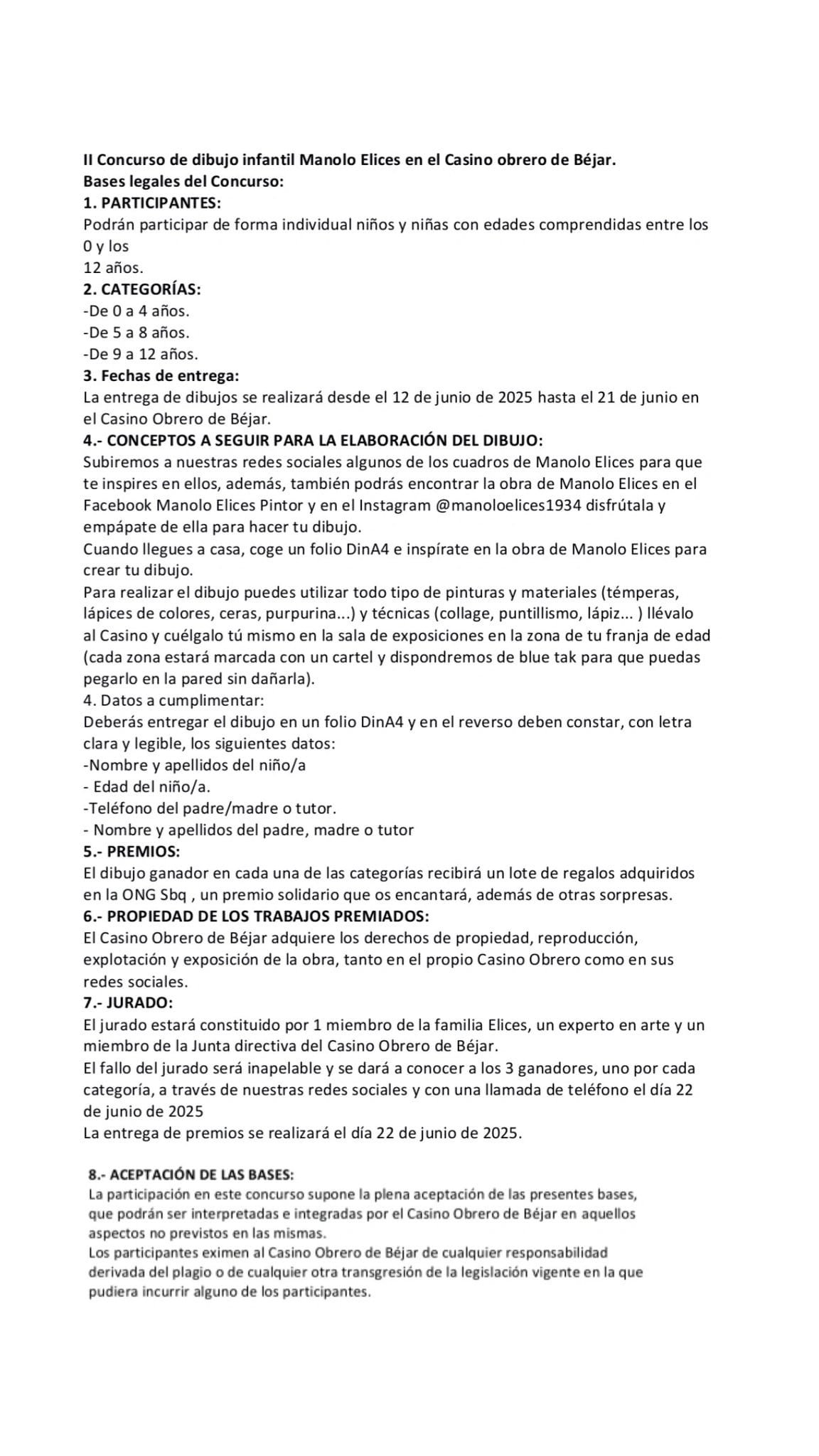 Podrán participar niñas y niños de entre 0 y 12 años, organizados en tres categorías de edad: de 0 a 4 años, de 5 a 8 años y de 9 a 12 años. Los dibujos deberán realizarse en casa, en formato Din A4, inspirados en la obra de Manolo Elices, accesible a través de las redes sociales oficiales: Facebook (Manolo Elices Pintor) e Instagram (@manoloelices1934).