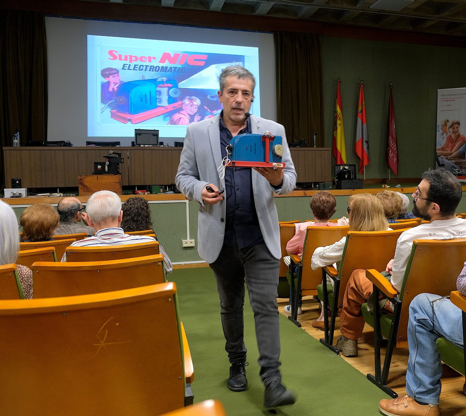 El protagonista de la jornada fue el Cine Nic, el icónico «cine de los niños», presentado magistralmente por Antonio Sánchez Sánchez, reconocido coleccionista y uno de los mayores especialistas de España en estos aparatos creados por los hermanos Nicolau en los años 30.