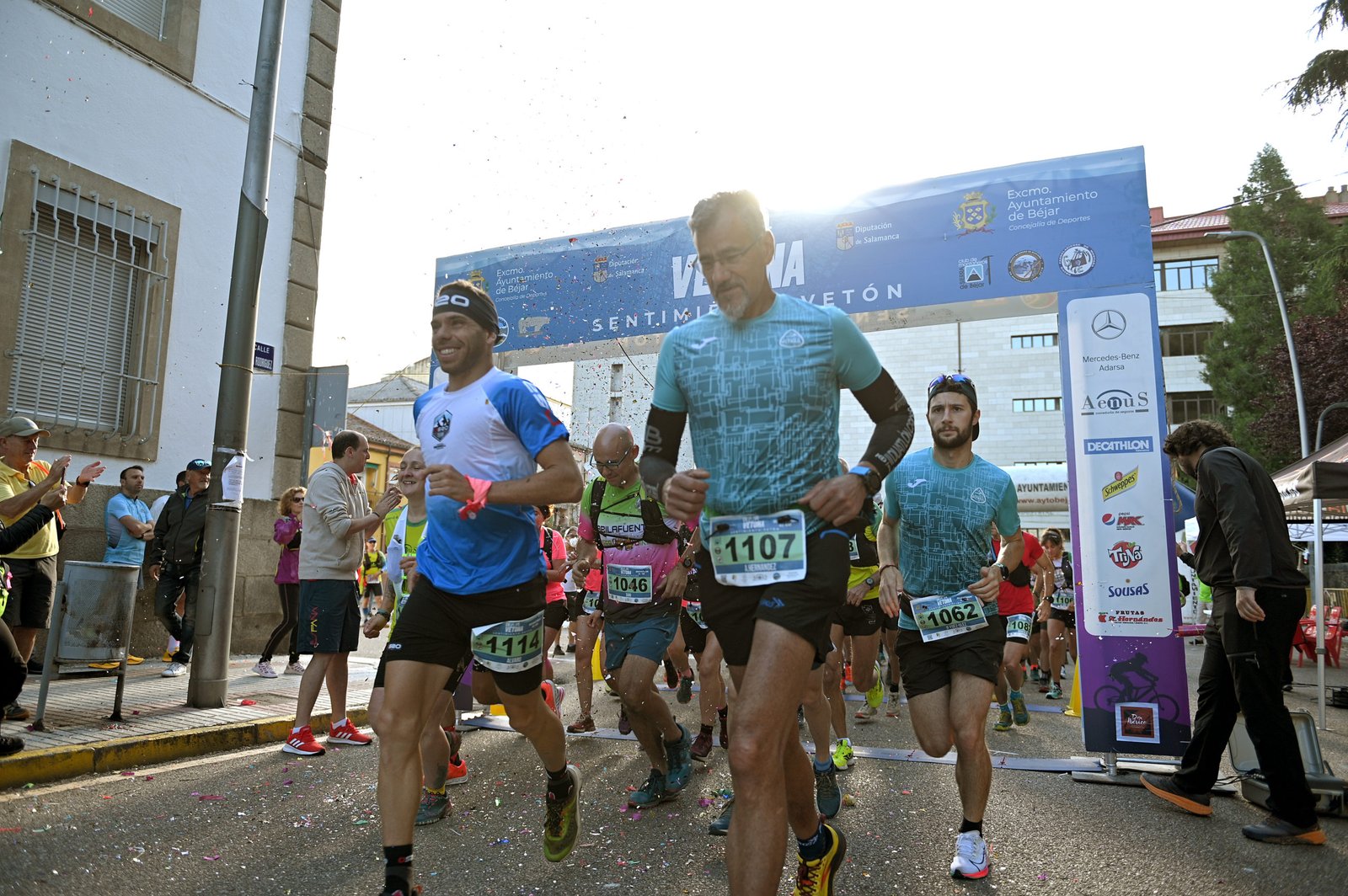 La novena edición de la Ruta Vetona comenzó este sábado a las 8:00 de la mañana en la Plaza de Santa Teresa, Béjar, Salamanca. Fue la primera de las tres modalidades que hoy disfrutaron los participantes inscritos a las carreras a pie. La jornada salió redonda. Y es que tras las nubes de primera hora de la mañana el día abrió y el sol acompañó a los corredores a lo largo de su desafío. Jaime Calleja, con un tiempo de 9:20:00, y Carlos Enrique Soler, con 10:34:14, completaron el podio masculino de la modalidad más larga y exigente del programa. En el cuadro femenino la victoria estuvo mucho más abierta y, tras una aguerrida pelea entre las corredoras de cabeza, Concha Arias se imponía con un crono de 15:36:52. La segunda y tercera posición la compartieron Carmen Mesonero (16:05:51) y Paloma Martín (16:05:52).
