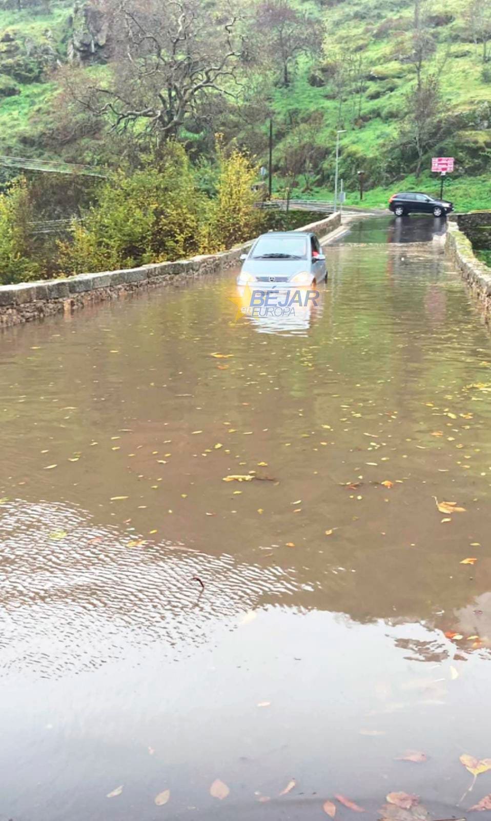 - La borrasca Efraín se hace notar con la inundación de una carretera, la caída de un tejado y árboles truncados