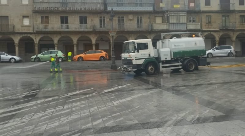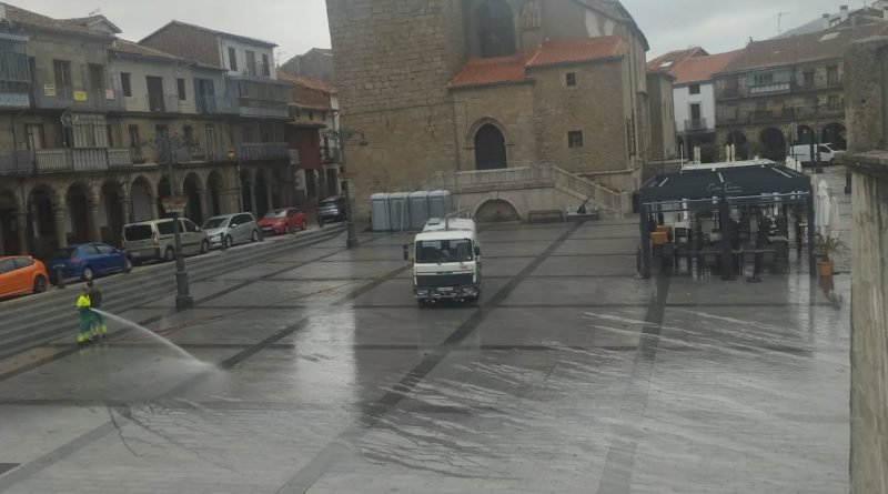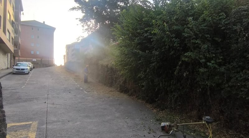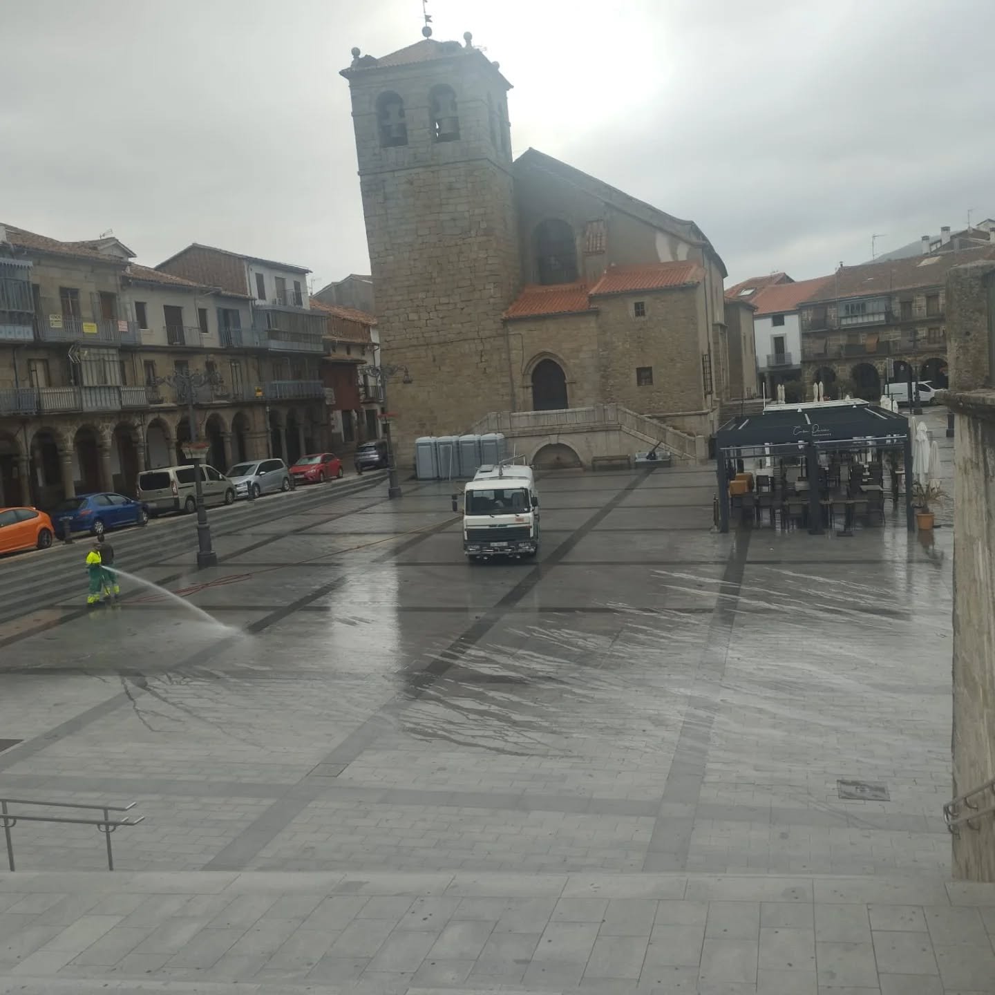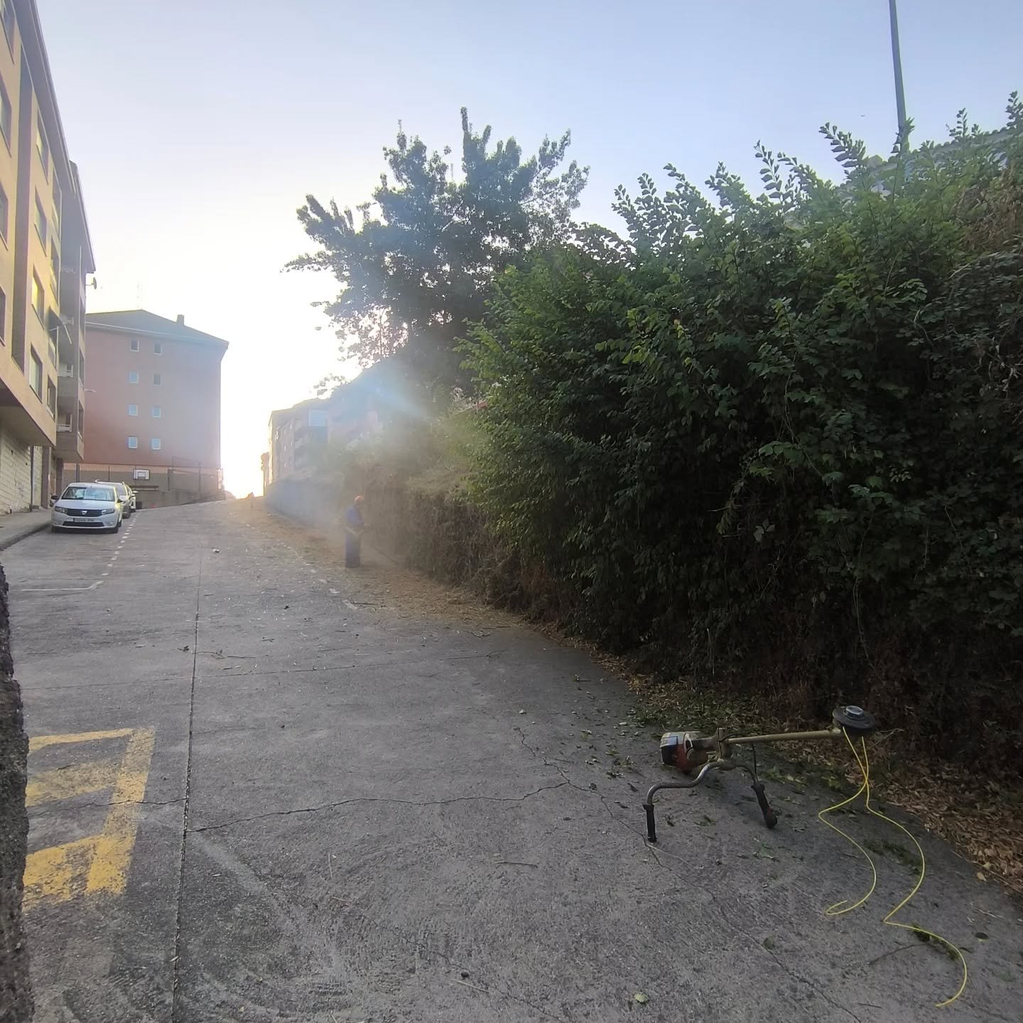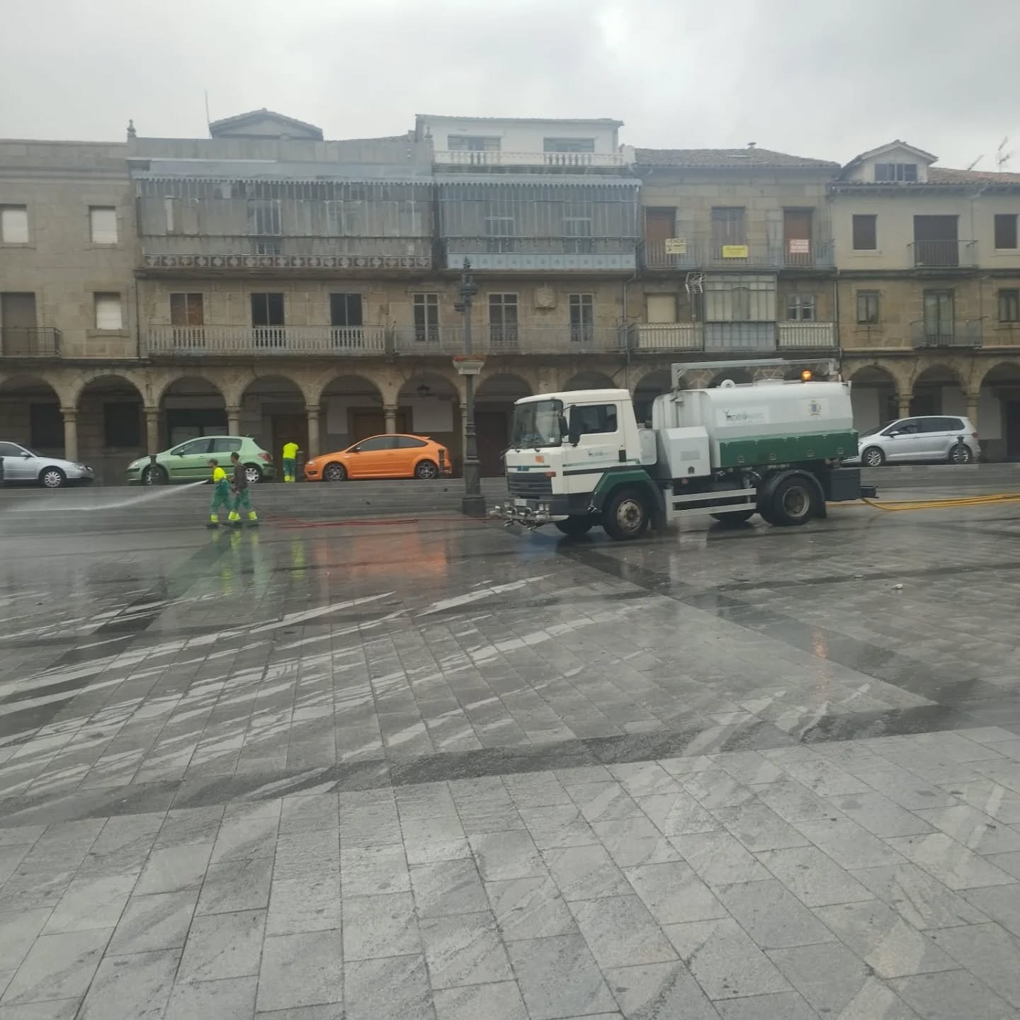 Estas labores de limpieza no eran flor de un día, y se continúan desarrollando en distintas zonas de la ciudad, incluyendo actuaciones de desbroce, limpieza viaria y acondicionamiento de espacios públicos. Estas tareas, que están siendo llevadas a cabo por operarios municipales, afectan tanto a áreas verdes como a zonas céntricas, como se observa en la Plaza Mayor, y también a calles con vegetación descontrolada.