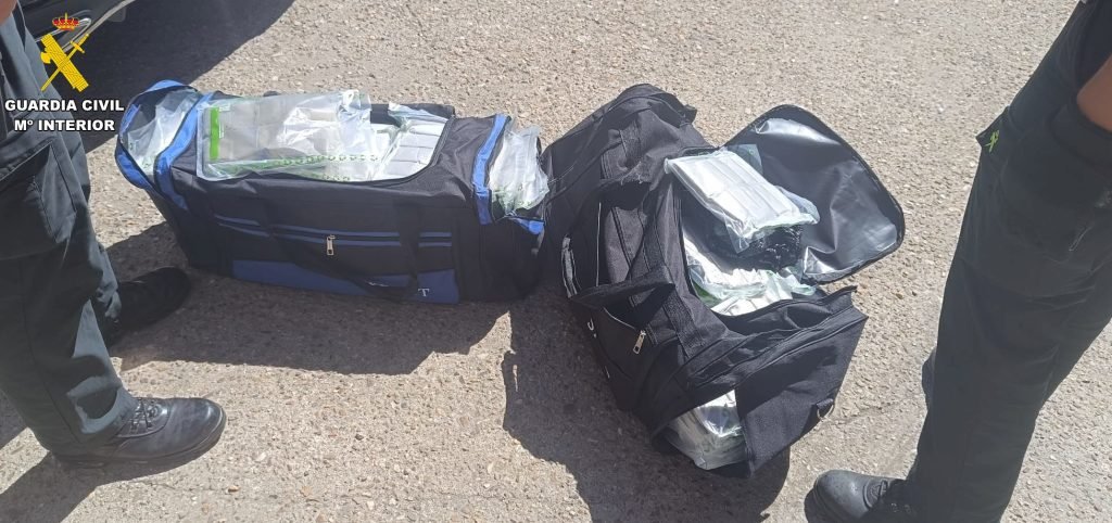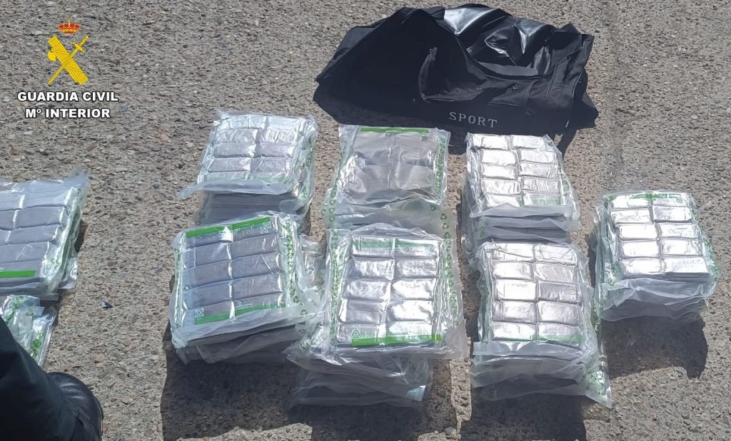 Durante la inspección, los agentes localizaron dos mochilas deportivas cargadas con paquetes precintados y envasados al vacío, que contenían pastillas de hachís con un peso total de 76.800 gramos. La droga se encontraba dispuesta de forma que facilitaba su transporte y posible distribución.