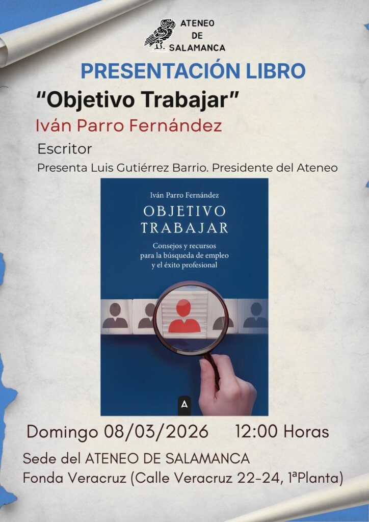 Salamanca se convertirá este domingo 8 de marzo en el epicentro de la reflexión sobre el futuro del empleo. La Fonda Veracruz, sede del prestigioso Ateneo de Salamanca, abrirá sus puertas a las 12:00 horas para acoger la presentación de «Objetivo trabajar», la última obra del sociólogo y escritor bejarano Iván Parro Fernández.