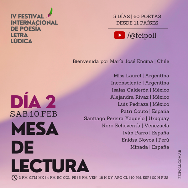 Todas las mesas podrán seguirse en directo del 9 al 13 de febrero a partir de las 21 horas de España en el canal de Youtube del festival: www.youtube.com/@feipoll