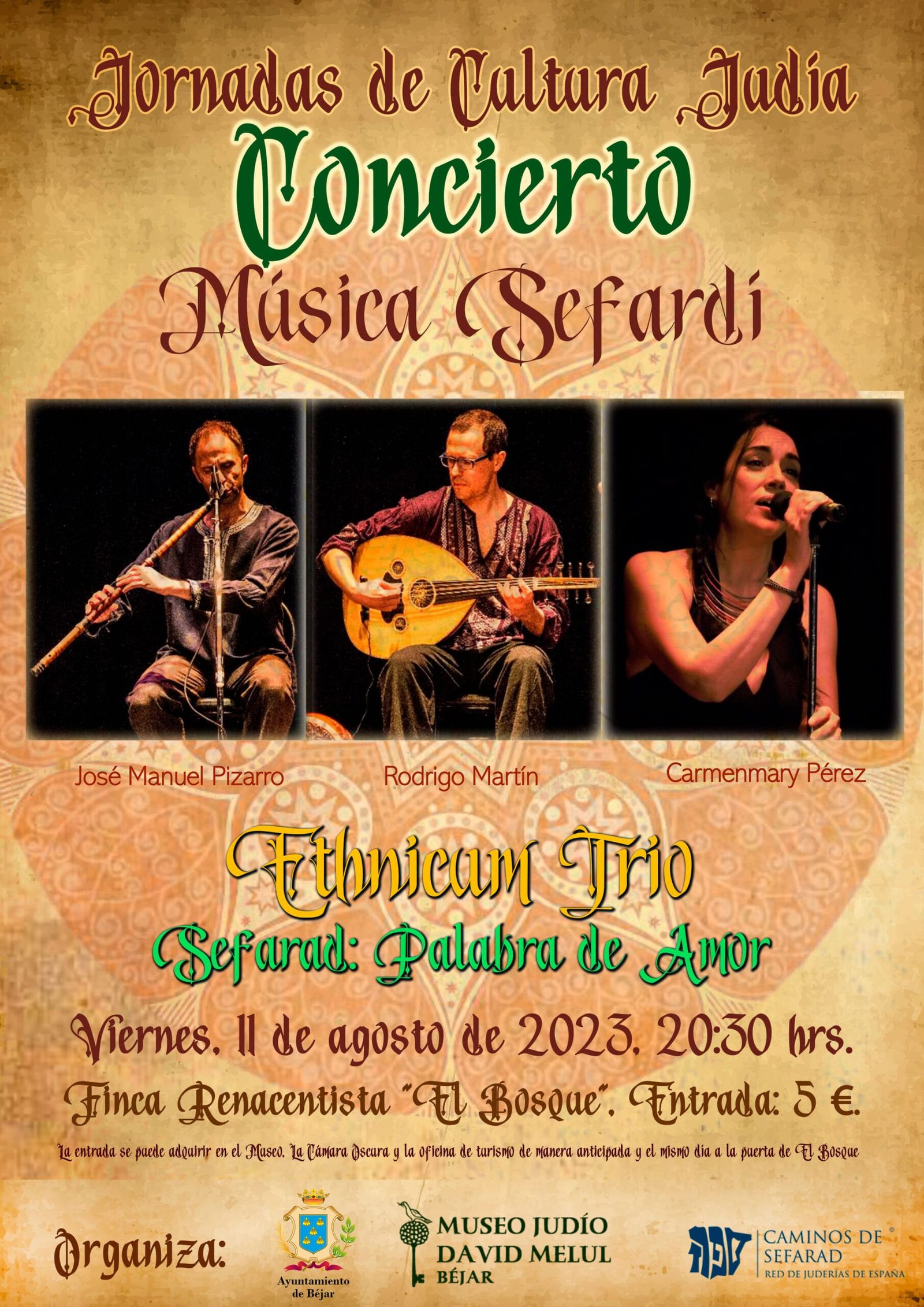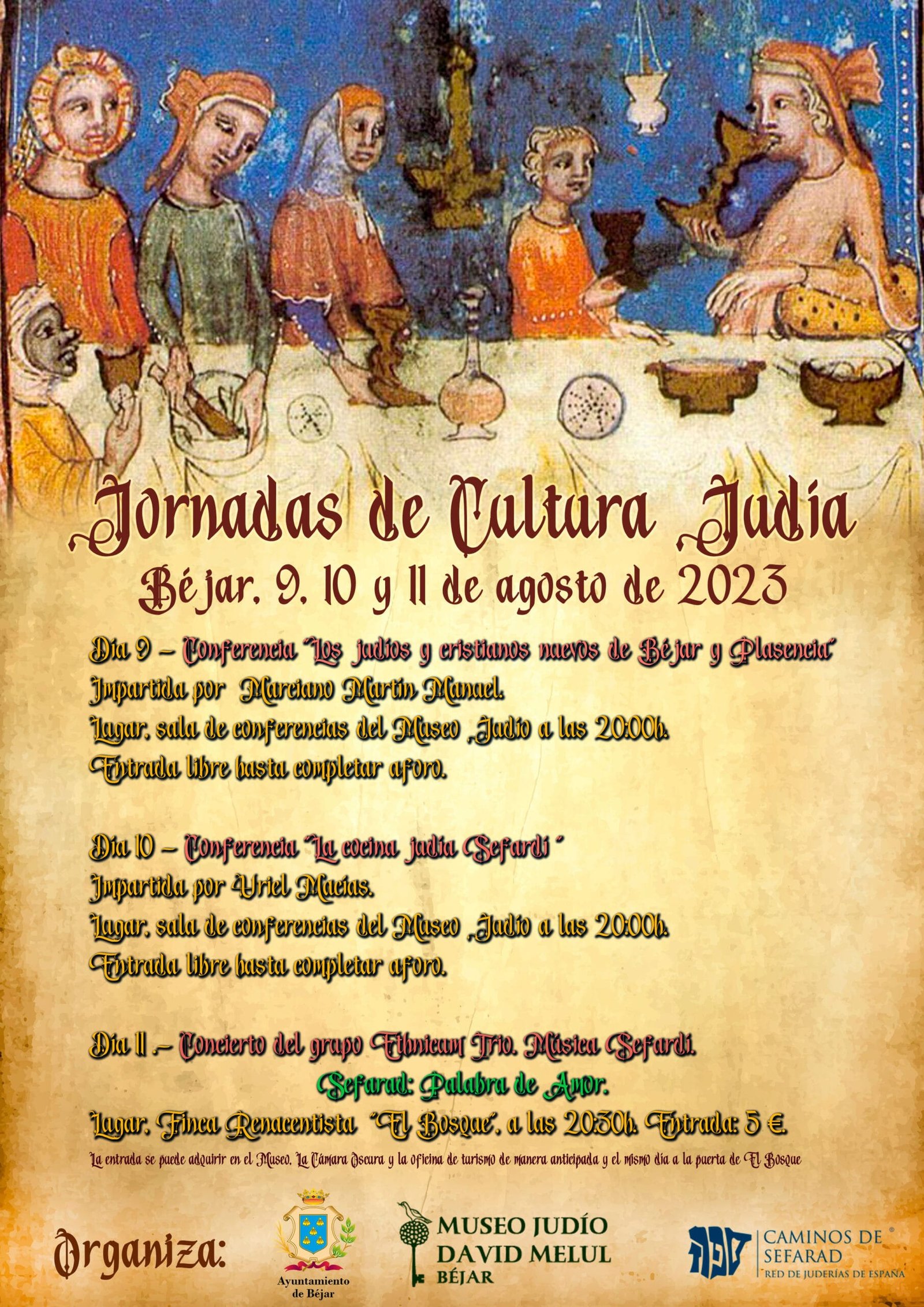 Las jornadas concluyen el viernes, 11 de agosto, con un concierto del grupo Ethnicam Trío. Sefarad: palabra de Amor. Será a partir de las 20:30 horas en la Finca Renacentista `El Bosque´, con un coste de cinco euros por persona; la entrada se puede adquirir en el Museo David Melul, La Cámara Oscura y en la Oficina de Turismo de Béjar de forma anticipada y el mismo día en la puerta de `El Bosque´.