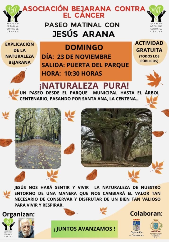 La Asociación Bejarana contra el Cáncer convoca el próximo domingo 23 de noviembre un paseo matinal abierto a todos los públicos, donde la exploración de la naturaleza local y la sensibilización ecológica serán los protagonistas. La cita es a las 10:30 horas en la puerta del parque municipal de Béjar y la actividad, de acceso gratuito, propone un recorrido desde el parque hasta el emblemático árbol centenario de la zona, con paradas destacadas como Santa Ana y La Centena.