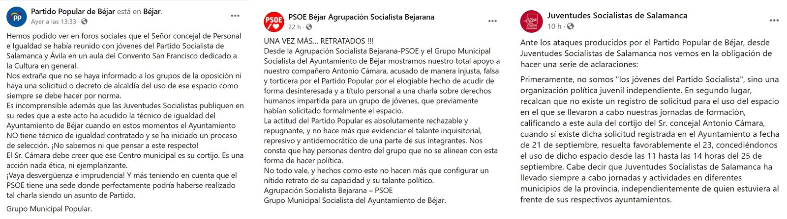 El PP de Béjar, a través de las redes sociales, acusó de realizar «una acción nada ética, ni ejemplarizante» al concejal del equipo de Gobierno, Antonio Cámara (PSOE), y de creer que el Centro Municipal de Cultura San Francisco «es su cortijo», al acudir a un encuentro con Juventudes Socialistas sobre Derechos Humanos en esa dependencia pública y «no se haya informado a los grupos de la oposición, ni haya solicitud o decreto de alcaldía del uso de ese espacio como siempre se debe hacer por norma».