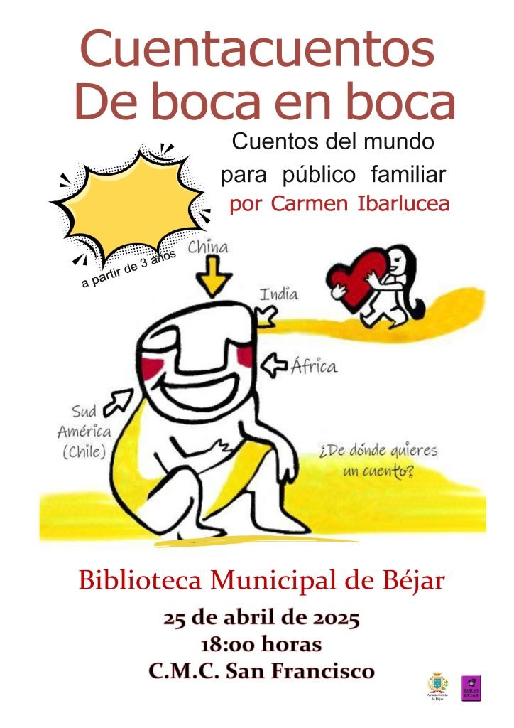 Como broche de oro a esta semana literaria, el día 25 de abril, la narradora Carmen Ibarlucea presentará su espectáculo “De boca en boca. Cuentos del mundo”, dirigido a público familiar a partir de 3 años. Este cuentacuentos tendrá lugar en el Centro Municipal de Cultura San Francisco, a las 18:00 horas. Una oportunidad para que niños y adultos compartan historias que viajan de generación en generación.