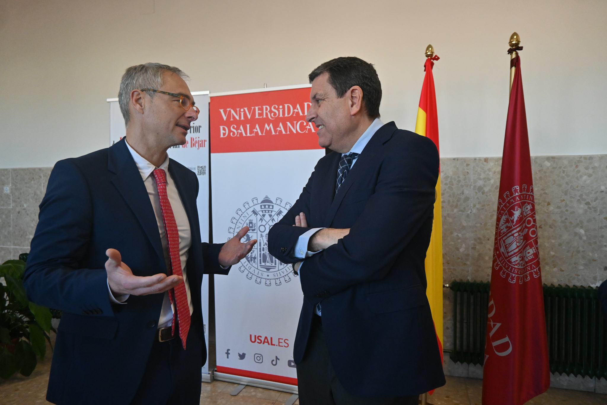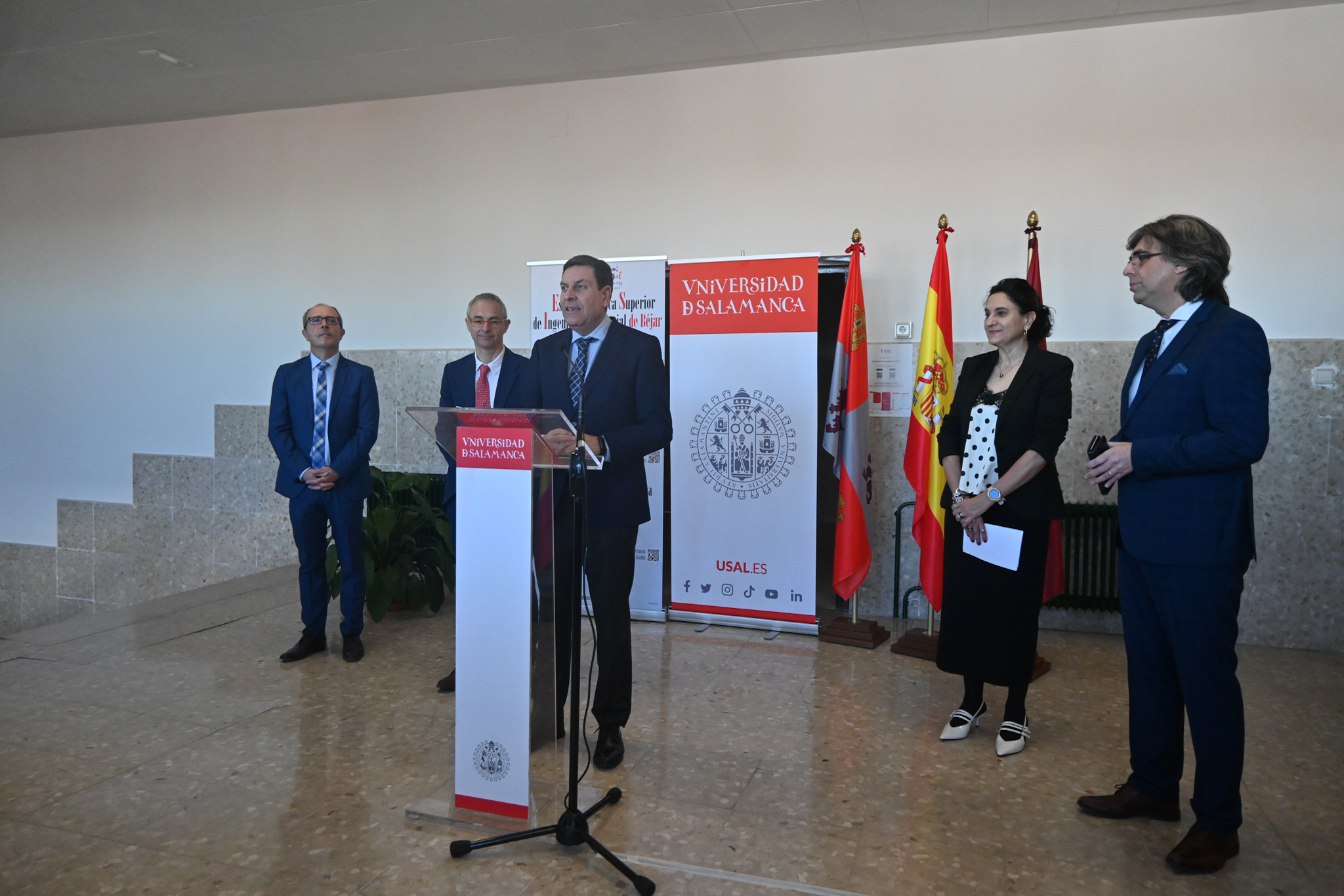 El rector, Ricardo Rivero, y el consejero de Economía y Hacienda de la Junta de Castilla y León, Carlos Fernández Carriedo, han presentado a los medios las instalaciones, acompañados por el director del centro, Alejandro Reveriego, y por la directora del Servicio de Inserción Profesional, Prácticas y Empleo de la USAL, Emilia Pizarro. También han estado presentes en el acto el vicerrector de Economía de la universidad, Javier González Benito, y alcalde Béjar, Luis Francisco Martín, entre otras autoridades.