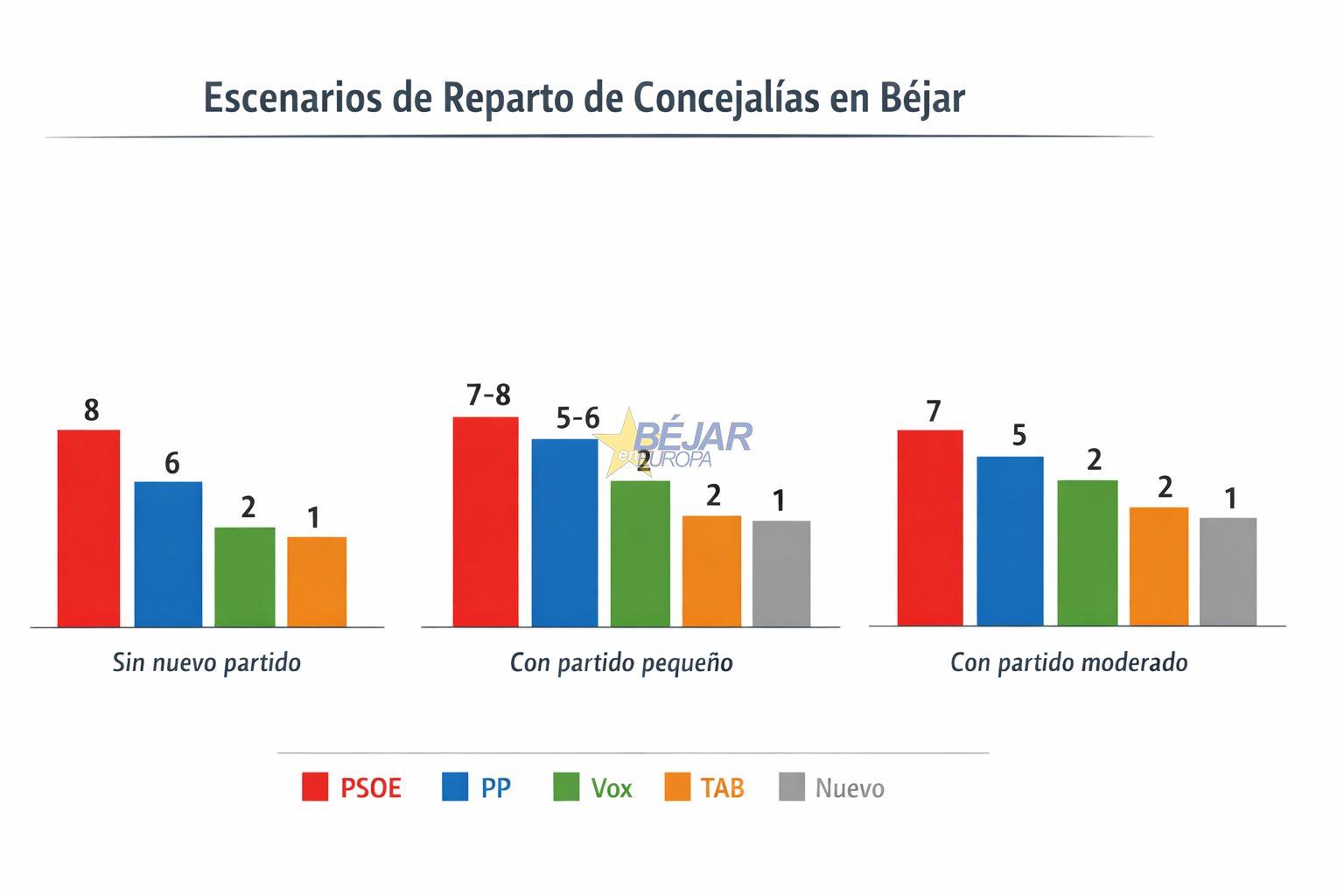 La posible irrupción de un nuevo partido o coalición convierte las elecciones municipales de 2027 en Béjar en un escenario más fragmentado e imprevisible. Aunque el PSOE mantiene ventaja, los pactos locales podrían ser decisivos para gobernabilidad, y la aparición de nuevas fuerzas resalta la importancia de TAB, y de cualquier alianza estratégica, que logre consolidar mayorías en el Ayuntamiento.