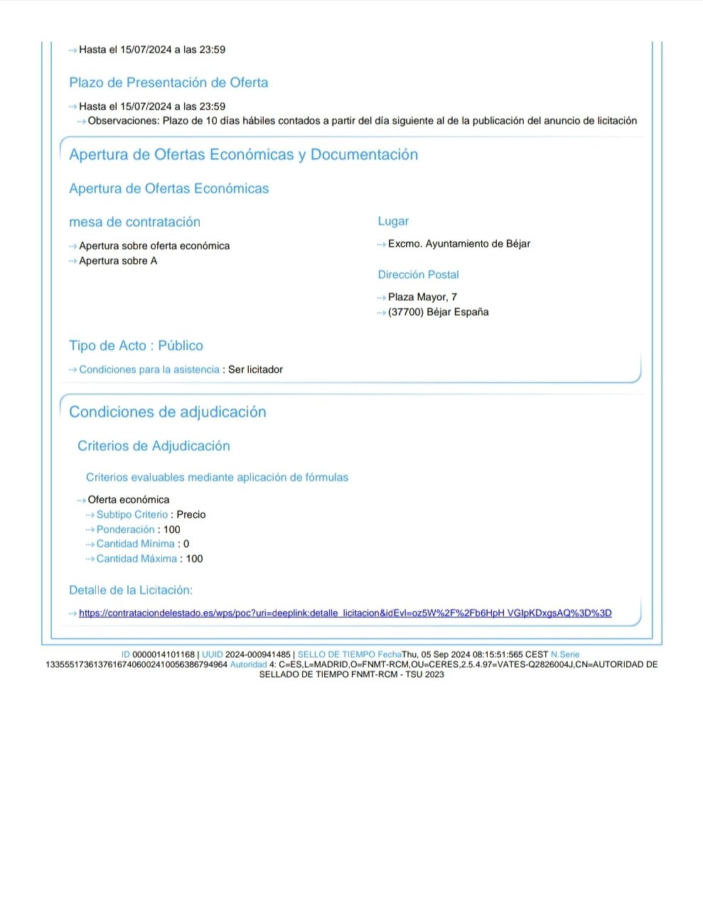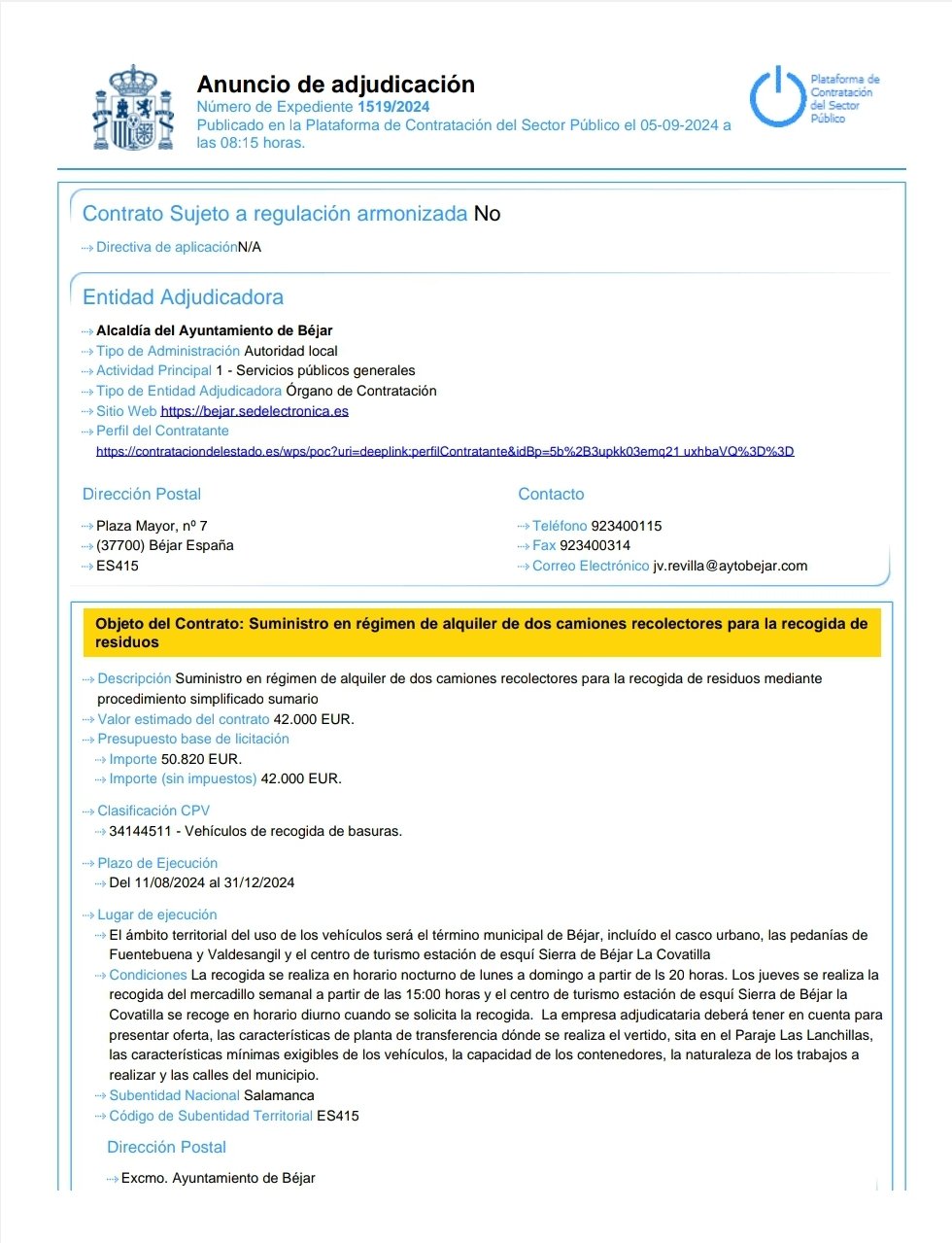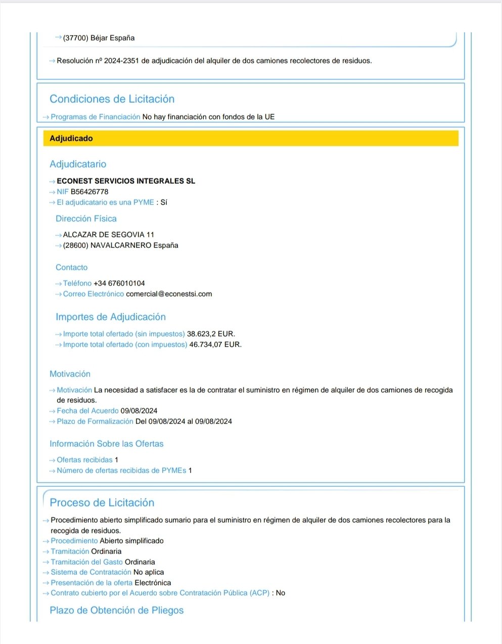 Sin embargo, y según ha podido saber BÉJAR EN EUROPA, el Ayuntamiento de Béjar sacó a concurso el 1 de julio de 2024 el «suministro en régimen de alquiler de dos camiones recolectores para la recogida de residuos mediante procedimiento simplificado sumario», con un presupuesto base de licitación que ascendía a 50.820 euros, quitando «31.376 euros a la revisión del Plan Especial para la Protección del Conjunto Histórico», y un «plazo de ejecución del 11 de agosto al 31 de diciembre de 2024». Posteriormente, el 9 de agosto de 2024, se formalizó el acuerdo de esa adjudicación con la empresa ECONEST SERVICIOS INTEGRALES SL por un «importe total de adjudicación de 46.734,07 euros».