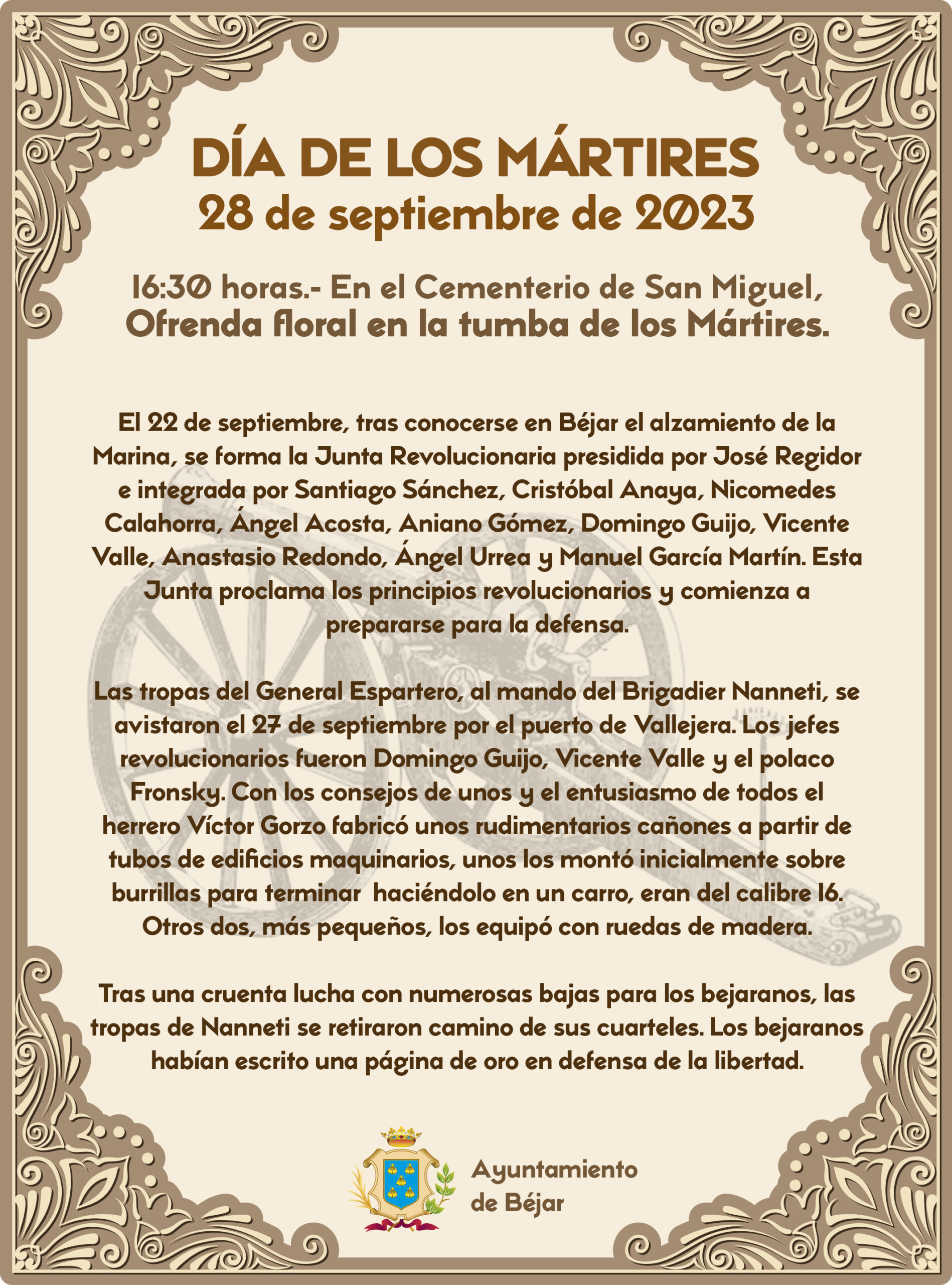 El 28 de septiembre, a las 16:30 horas, tendrá lugar la tradicional Ofrenda floral en la tumba de los mártires, en el cementerio municipal de San Miguel de Béjar.