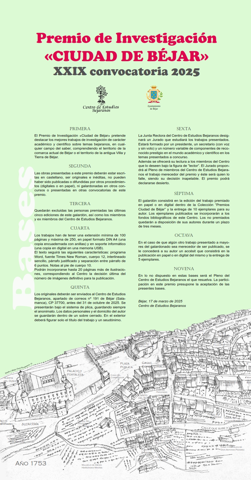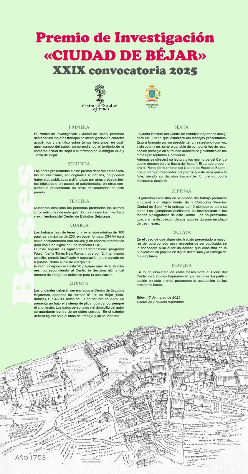 En el pasado pleno ordinario de miembros del Centro de Estudios Bejaranos, se aprobaron las bases de la convocatoria del Premio “Ciudad de Béjar” 2025, en su edición número XXIX.