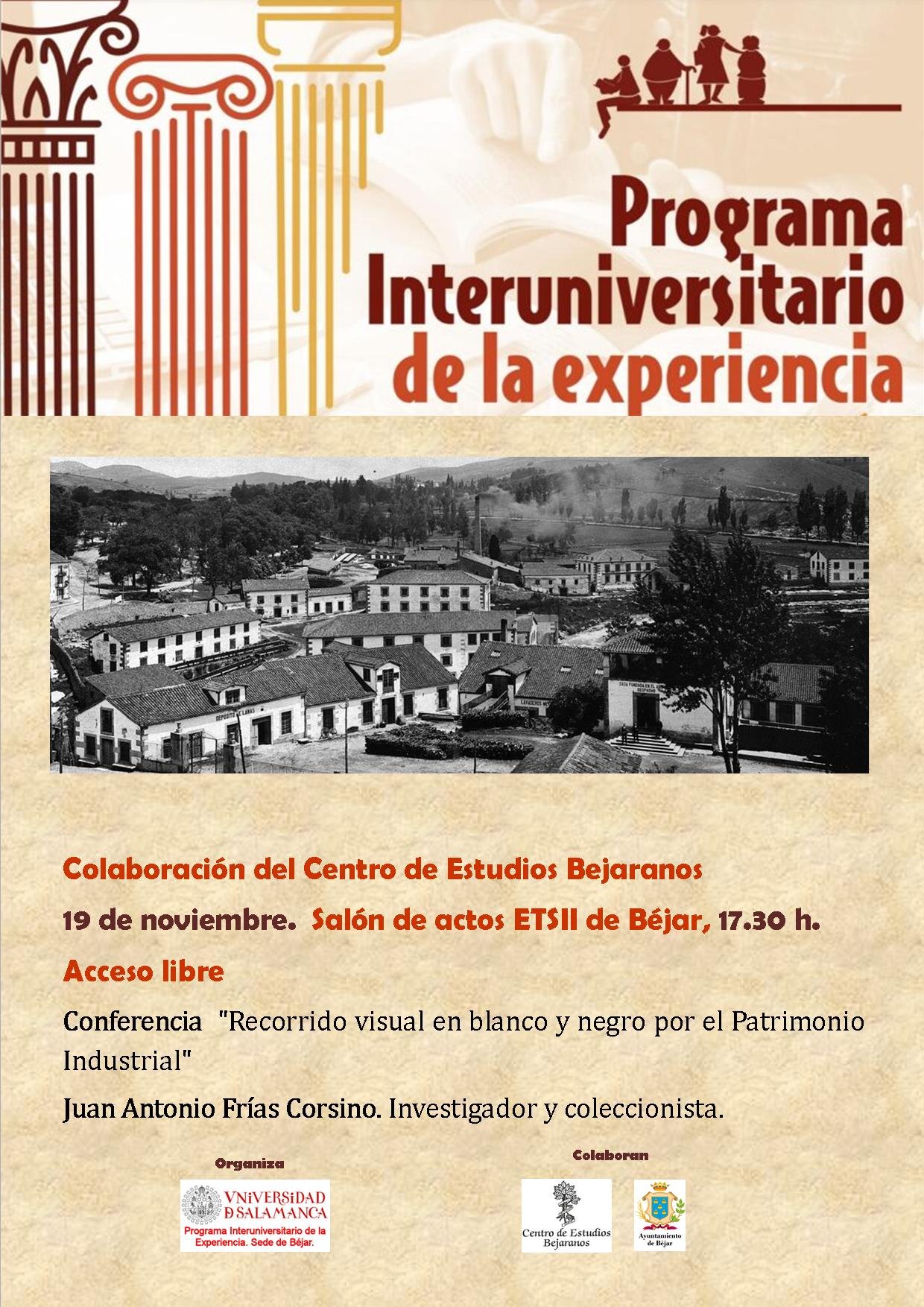 El próximo miércoles 19 de noviembre, continúa la colaboración con la Universidad de la Experiencia en su sede de Béjar con una nueva cita cultural. En esta ocasión, el protagonista será Juan Antonio Frías Corsino, quien ofrecerá la conferencia titulada “Recorrido visual en blanco y negro por el Patrimonio Industrial”.