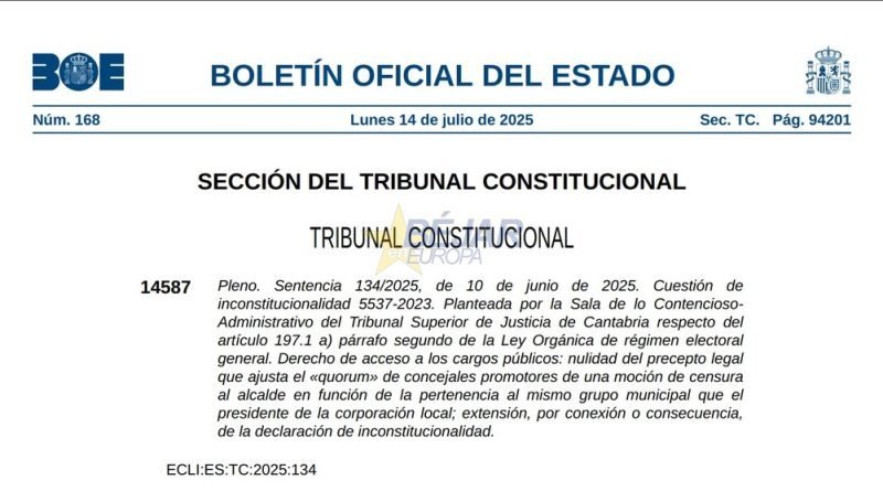 El Tribunal Constitucional ha declarado inconstitucional y nulo un precepto fundamental de la Ley Orgánica del Régimen Electoral General (LOREG) que dificultaba las mociones de censura por parte de concejales que hubieran pertenecido al mismo grupo político que el alcalde. Esta decisión, publicada en el BOE este lunes bajo la Sentencia 134/2025, elimina una de las barreras más controvertidas para el ejercicio pleno del control democrático en los ayuntamientos.