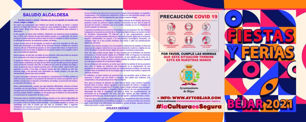 Las Fiestas contarán con actividades para los más pequeños, con el Festival de las Artes en calles, plazas y patios de Béjar, música en las diferentes terrazas de la ciudad, el festival de Fusión y Rap Music Experience, Urban Off, conciertos, teatro y más sorpresas. Algunos de estos eventos ya fueron adelantados por BÉJAR EN EUROPA incluso antes de su adjudicación (por ejemplo el Festival de Fusión y Rap ‘Music Experience’ anticipado el pasado 7 de junio).
