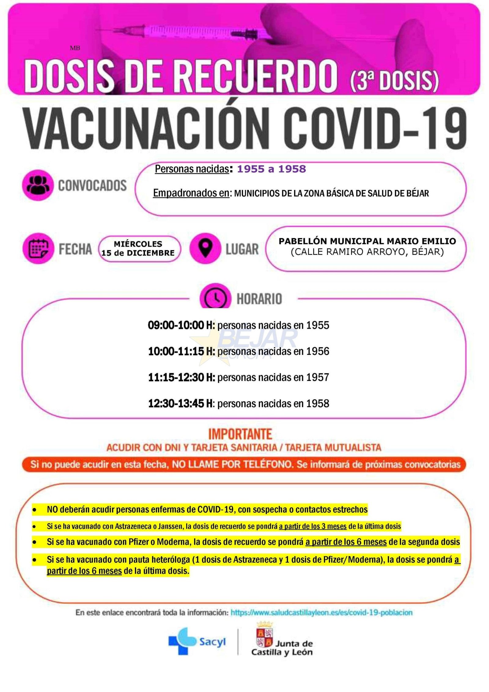 El SACyL ha organizado varias jornadas en Béjar para administrar terceras dosis de refuerzo de la vacuna Covid-19 dirigidos a personal sanitario, sociosanitario, y personas nacidas entre 1955 y 1961.